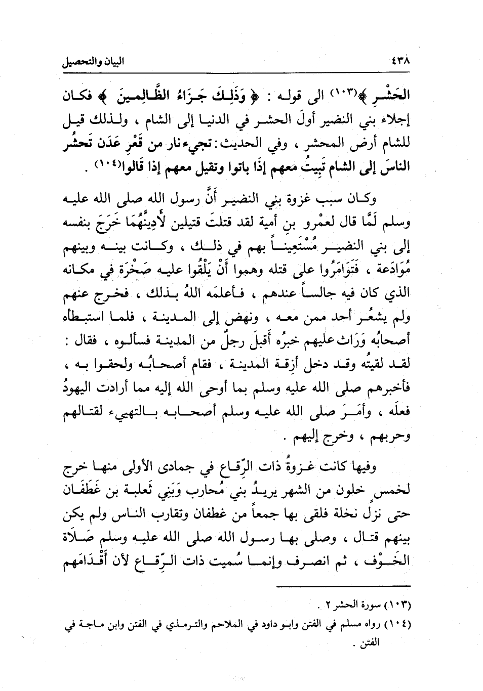 إلى قوله: {وَذَلِكَ جَزَاءُ الظَّالِمِينَ} [الحشر: 17] فكان إجلاء بني النضير أول الحشر في الدنيا إلى الشام، ولذلك قيل للشام أرض المحشر، وفي الحديث: «تجيء نار من قعر عدن تحشر الناس إلى الشام تبيت معهم إذا باتوا وتقيل معهم إذا قالوا» .