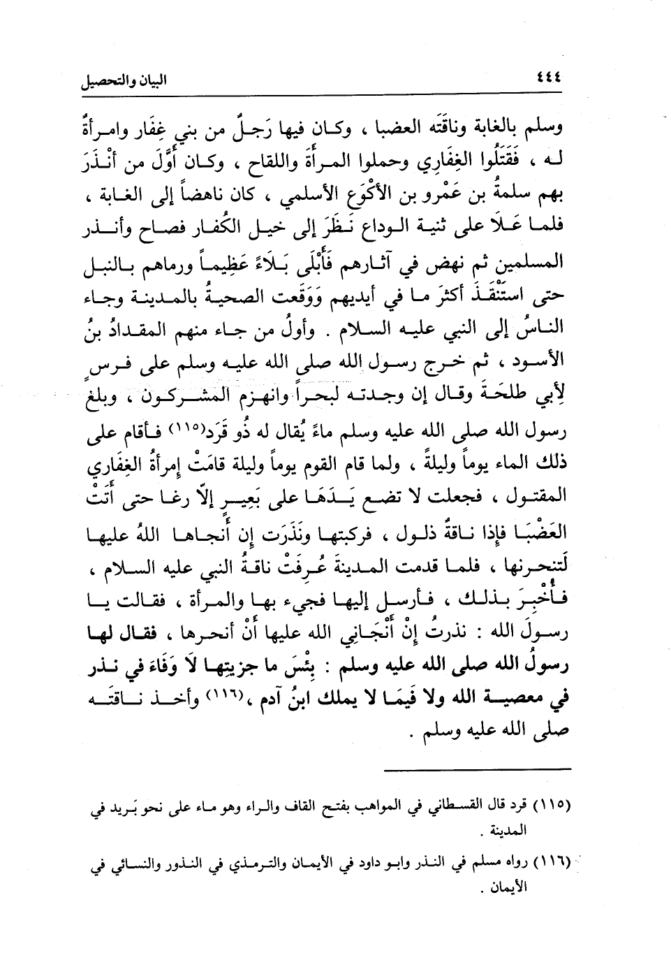 وأول من جاء منهم المقداد بن الأسود، ثم خرج رسول الله - صَلَّى اللَّهُ عَلَيْهِ وَسَلَّمَ - على فرس لأبي طلحة، وقال: إن وجدته لبحرا وانهزم المشركون، وبلغ رسول الله - صَلَّى اللَّهُ عَلَيْهِ وَسَلَّمَ - ماء يقال له ذو قرد، فأقام على ذلك الماء يوما وليلة، ولما قام القوم يوما وليلة قامت امرأة الغفاري المقتول، فجعلت لا تضع يدها على بعير إلا رغا حتى أتت العضبا، فإذا ناقة ذلول، فركبتها ونذرت إن أنجاها الله عليها لتنحرنها، فلما قدمت المدينة عرفت ناقة النبي - عَلَيْهِ السَّلَامُ -، فأخبر بذلك، فأرسل إليها فجيء بها والمرأة، فقالت: يا رسول الله، نذرت إن أنجاني الله عليها أن أنحرها، فقال لها رسول الله - صَلَّى اللَّهُ عَلَيْهِ وَسَلَّمَ -: «بئس ما جزيتها، لا وفاء في نذر في معصية الله ولا فيما لا يملك ابن آدم» ، وأخذ ناقته - صَلَّى اللَّهُ عَلَيْهِ وَسَلَّمَ -.