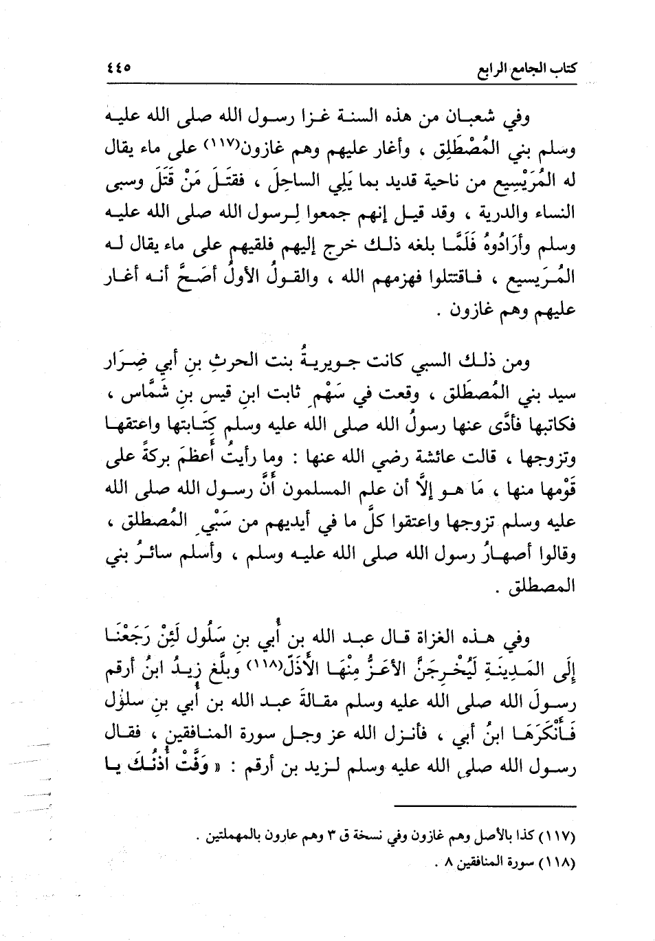 وفي شعبان من هذه السنة غزا رسول الله - صَلَّى اللَّهُ عَلَيْهِ وَسَلَّمَ - بني المصطلق، وأغار عليهم وهم غازون على ماء يقال له المريسيع من ناحية قديد بما يلي الساحل، فقتل من قتل وسبى النساء والذرية، وقد قيل: إنهم جمعوا لرسول الله - صَلَّى اللَّهُ عَلَيْهِ وَسَلَّمَ - وأرادوه، فلما بلغه ذلك خرج إليهم فلقيهم على ماء يقال له المريسيع، فاقتتلوا فهزمهم الله، والقول الأول أصح أنه أغار عليهم وهم غارون.