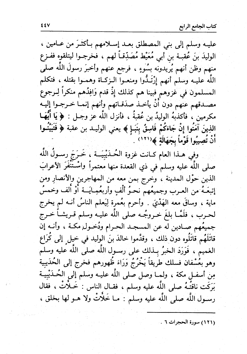 عليه وسلم إلى بني المصطلق بعد إسلامهم بأكثر من عامين - الوليد بن عقبة بن أبي معيط مصدقا لهم، فخرجوا ليتلقوه ففزع منهم وظن أنهم يريدونه بسوء، فرجع عنهم وأخبر رسول الله - صَلَّى اللَّهُ عَلَيْهِ وَسَلَّمَ - أنهم ارتدوا ومنعوا الزكاة وهموا بقتله، فتكلم المسلمون في غزوهم، فبينا هم كذلك إذ قدم وافدهم منكرا لرجوع مصدقهم عنهم دون أن يأخذ صدقاتهم وأنهم إنما خرجوا إليه مكرمين، فأكذبه الوليد بن عقبة، فأنزل الله عز وجل: {يَا أَيُّهَا الَّذِينَ آمَنُوا إِنْ جَاءَكُمْ فَاسِقٌ بِنَبَإٍ} [الحجرات: 6] يعني الوليد بن عقبة، {فَتَبَيَّنُوا أَنْ تُصِيبُوا قَوْمًا بِجَهَالَةٍ} [الحجرات: 6] .
