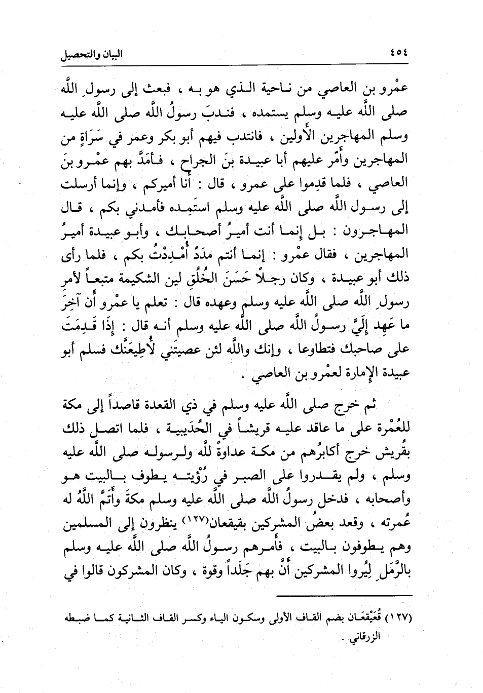 عمرو بن العاص من ناحية الذي هو به، فبعث إلى رسول الله - صَلَّى اللَّهُ عَلَيْهِ وَسَلَّمَ - يستمده، فندب رسول الله - صَلَّى اللَّهُ عَلَيْهِ وَسَلَّمَ - المهاجرين الأولين، فانتدب فيهم أبو بكر وعمر في سراة من المهاجرين وأمر عليهم أبا عبيدة بن الجرح، فأمد بهم عمرو بن العاص، فلما قدموا على عمرو، قال: أنا أميركم، وإنما أرسلت إلى رسول الله - صَلَّى اللَّهُ عَلَيْهِ وَسَلَّمَ - أستمده فأمدني بكم، قال المهاجرون: بل إنما أنت أمير أصحابك، وأبو عبيدة أمير المهاجرين، فقال عمرو: إنما أنتم مدد أمددت بكم، فلما رأى ذلك أبو عبيدة، وكان رجلا حسن الخلق لين الشكيمة متبعا لأمر رسول الله - صَلَّى اللَّهُ عَلَيْهِ وَسَلَّمَ - وعهده، قال: تعلم يا عمرو أن آخر ما عهد إِلَيَّ رسول الله - صَلَّى اللَّهُ عَلَيْهِ وَسَلَّمَ - أنه قال: إذا قدمت على صاحبك فتطاوعا، وإنك والله لئن عصيتني لأطيعنك، فسلم أبو عبيدة الإمارة لعمرو بن العاص.