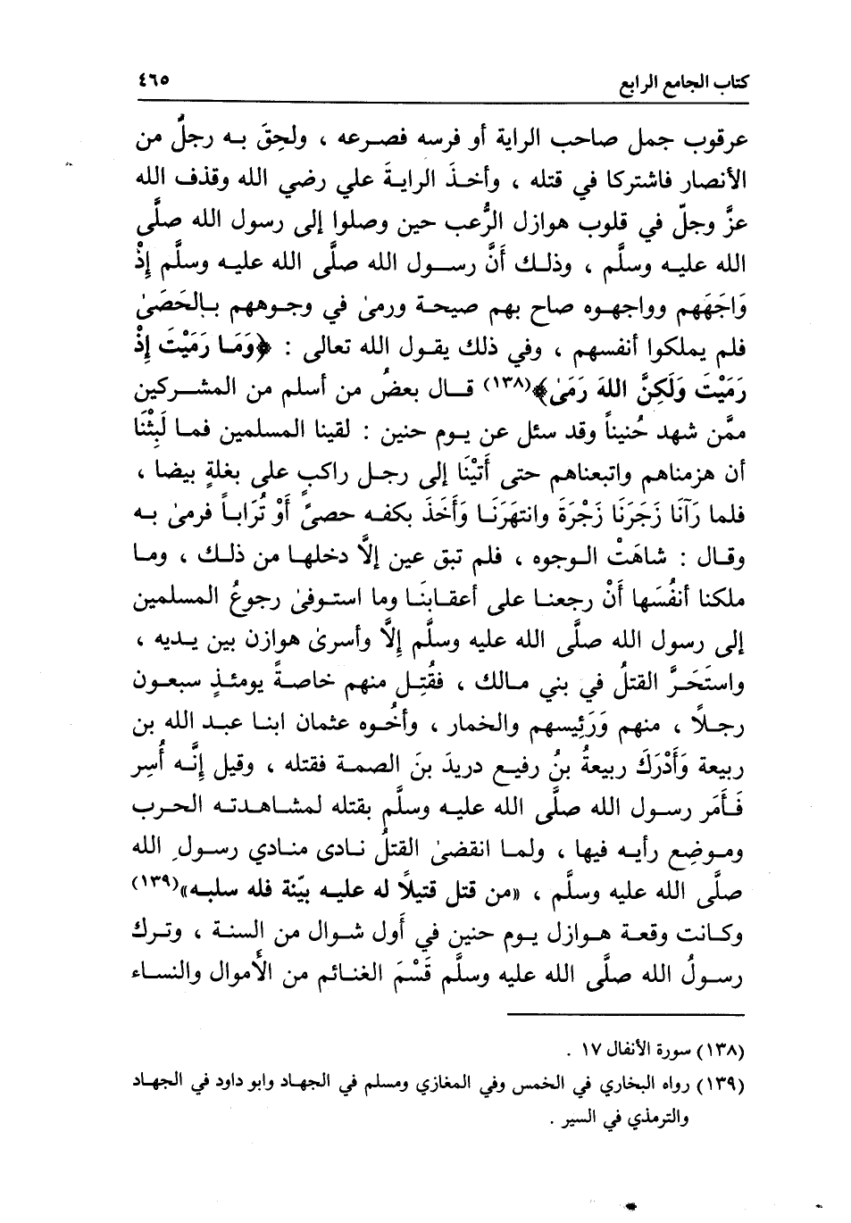 عرقوب جمل صاحب الراية أو فرسه فصرعه، ولحق به رجل من الأنصار فاشتركا في قتله، وأخذ الراية علي - رَضِيَ اللَّهُ عَنْهُ -، وقذف الله عز وجل في قلوب هوازن الرعب حين وصلوا إلى رسول الله - صَلَّى اللَّهُ عَلَيْهِ وَسَلَّمَ -، وذلك أن رسول الله - صَلَّى اللَّهُ عَلَيْهِ وَسَلَّمَ - إذ واجههم وواجهوه صاح بهم صيحة ورمى في وجوههم بالحصى فلم يملكوا أنفسهم، وفي ذلك يقول الله تعالى: {وَمَا رَمَيْتَ إِذْ رَمَيْتَ وَلَكِنَّ اللَّهَ رَمَى} [الأنفال: 17] ، قال بعض من أسلم من المشركين ممن شهد حنينا، وقد سئل عن يوم حنين: لقينا المسلمين فما لبثنا أن هزمناهم واتبعناهم حتى أتينا إلى رجل راكب على بغلة بيضا، فلما رآنا زجرنا زجرة وانتهرنا وأخذ بكفه حصى أو ترابا، فرمى به، وقال: «شاهت الوجوه» ، فلم تبق عين إلا دخلها من ذلك، وما ملكنا أنفسنا أن رجعنا على أعقابنا، وما استوفى رجوع المسلمين إلى رسول الله - صَلَّى اللَّهُ عَلَيْهِ وَسَلَّمَ - إلا وأسرى هوازن بين يديه، واستحر القتل في بني مالك، فقتل منهم خاصة يومئذ سبعون رجلا منهم، ورئيسهم والخمار، وأخوه عثمان ابنا عبد الله بن ربيعة، وأدرك ربيعة بن رفيع دريد بن الصمة فقتله، وقيل: إنه أسر، فأمر رسول الله - صَلَّى اللَّهُ عَلَيْهِ وَسَلَّمَ - بقتله لمشاهدته الحرب وموضع رأيه فيها، ولما انقضى القتل نادى منادي رسول الله - صَلَّى اللَّهُ عَلَيْهِ وَسَلَّمَ -: «من قتل قتيلا له عليه بينة فله سلبه» ، وكانت وقعة هوازن يوم حنين في أول شوال من السنة، وترك رسول الله - صَلَّى اللَّهُ عَلَيْهِ وَسَلَّمَ - قسم الغنائم من الأموال والنساء