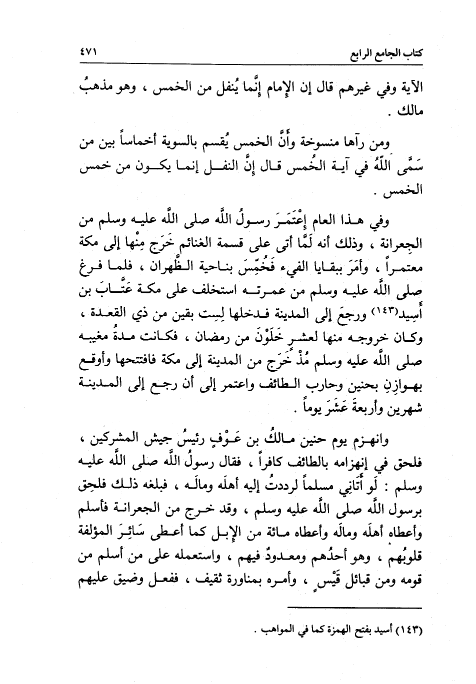 وفي هذا العام اعتمر رسول الله - صَلَّى اللَّهُ عَلَيْهِ وَسَلَّمَ - من الجعرانة، وذلك أنه لما أتى على قسمة الغنائم خرج منها إلى مكة معتمرا، وأمر ببقايا الفيء فخمس بناحية الظهران، فلما فرغ - صَلَّى اللَّهُ عَلَيْهِ وَسَلَّمَ - من عمرته استخلف على مكة عتاب بن أسيد ورجع إلى المدينة فدخلها لست بقين من ذي القعدة، وكان خروجه منها لعشر خلون من رمضان، فكانت مدة مغيبه - صَلَّى اللَّهُ عَلَيْهِ وَسَلَّمَ - مذ خرج من المدينة إلى مكة فافتتحها وأوقع بهوازن بحنين وحارب الطائف واعتمر إلى أن رجع إلى المدينة شهرين وأربعة عشر يوما.