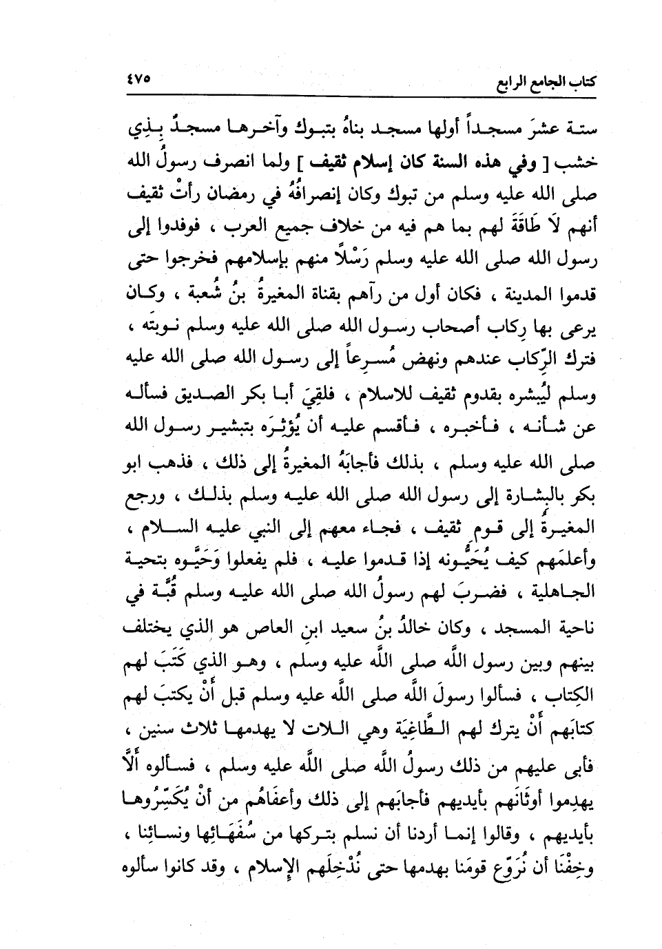 ستة عشر مسجدا أولها مسجد بناه بتبوك وآخرها مسجد بذي خشب [وفي هذه السنة كان إسلام ثقيف] ولما انصرف رسول الله - صَلَّى اللَّهُ عَلَيْهِ وَسَلَّمَ - من تبوك وكان انصرافه في رمضان رأت ثقيف أنهم لا طاقة لهم بما هم فيه من خلاف جميع العرب، فوفدوا إلى رسول الله - صَلَّى اللَّهُ عَلَيْهِ وَسَلَّمَ - رسلا منهم بإسلامهم، فخرجوا حتى قدموا المدينة، فكان أول من رآهم بقناة المغيرة بن شعبة، وكان يرعى بها ركاب أصحاب رسول الله - صَلَّى اللَّهُ عَلَيْهِ وَسَلَّمَ - نوبته، فترك الركاب عندهم ونهض مسرعا إلى رسول الله - صَلَّى اللَّهُ عَلَيْهِ وَسَلَّمَ - ليبشره بقدوم ثقيف للإسلام، فلقي أبا بكر الصديق فسأله عن شأنه، فأخبره، فأقسم عليه أن يؤثره بتبشير رسول الله - صَلَّى اللَّهُ عَلَيْهِ وَسَلَّمَ - بذلك، فأجابه المغيرة إلى ذلك، فذهب أبو بكر بالبشارة إلى رسول الله - صَلَّى اللَّهُ عَلَيْهِ وَسَلَّمَ - بذلك، ورجع المغيرة إلى قوم ثقيف، فجاء معهم إلى النبي - عَلَيْهِ السَّلَامُ -، وأعلمهم كيف يحيونه إذا قدموا عليه، فلم يفعلوا وحيوه بتحية الجاهلية، فضرب لهم رسول الله - صَلَّى اللَّهُ عَلَيْهِ وَسَلَّمَ - قبة في ناحية المسجد، وكان خالد بن سعيد بن العاص هو الذي يختلف بينهم وبين رسول الله - صَلَّى اللَّهُ عَلَيْهِ وَسَلَّمَ -، وهو الذي كتب لهم الكتاب، فسألوا رسول الله - صَلَّى اللَّهُ عَلَيْهِ وَسَلَّمَ - قبل أن يكتب لهم كتابهم أن يترك لهم الطاغية وهي اللات لا يهدمها ثلاث سنين، فأبى عليهم من ذلك رسول الله - صَلَّى اللَّهُ عَلَيْهِ وَسَلَّمَ -، فسألوه ألا يهدموا أوثانهم بأيديهم فأجابهم إلى ذلك، وأعفاهم من أن يكسروها بأيديهم، وقالوا: إنما أردنا أن نسلم بتركها من سفهائها ونسائنا، وخفنا أن نروع قومنا بهدمها حتى ندخلهم الإسلام، وقد كانوا سألوه