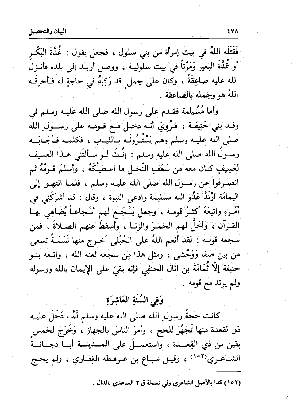 وأما مسيلمة فقدم على رسول الله - صَلَّى اللَّهُ عَلَيْهِ وَسَلَّمَ - في وفد بني حنيفة، فروي أنه دخل مع قومه على رسول الله - صَلَّى اللَّهُ عَلَيْهِ وَسَلَّمَ - وهم يسترونه بالثياب، فكلمه فأجابه رسول الله - صَلَّى اللَّهُ عَلَيْهِ وَسَلَّمَ -: «إنك لو سألتني هذا العسيف - لعسيف كان معه من سعف النخل- ما أعطيتكه» ، وأسلم قومه ثم انصرفوا عن رسول الله - صَلَّى اللَّهُ عَلَيْهِ وَسَلَّمَ -، فلما انتهوا إلى اليمامة ارتد عدو الله مسيلمة وادعى النبوة، وقال: قد أشركني في أمره، واتبعه أكثر قومه، وجعل يسجع لهم أسجاعا يضاهي بها القرآن، وأحل لهم الخمر والزنا، وأسقط عنهم الصلاة، فمن سجعه قوله: لقد أنعم الله على الحبلى أخرج منها نسمة تسعى من بين صفا ووحشى، ومثل هذا من سجعه لعنه الله، واتبعه بنو حنيفة إلا ثمامة بن أثال الحنفي، فإنه بقي على الإيمان بالله ورسوله ولم يرتد مع قومه.
