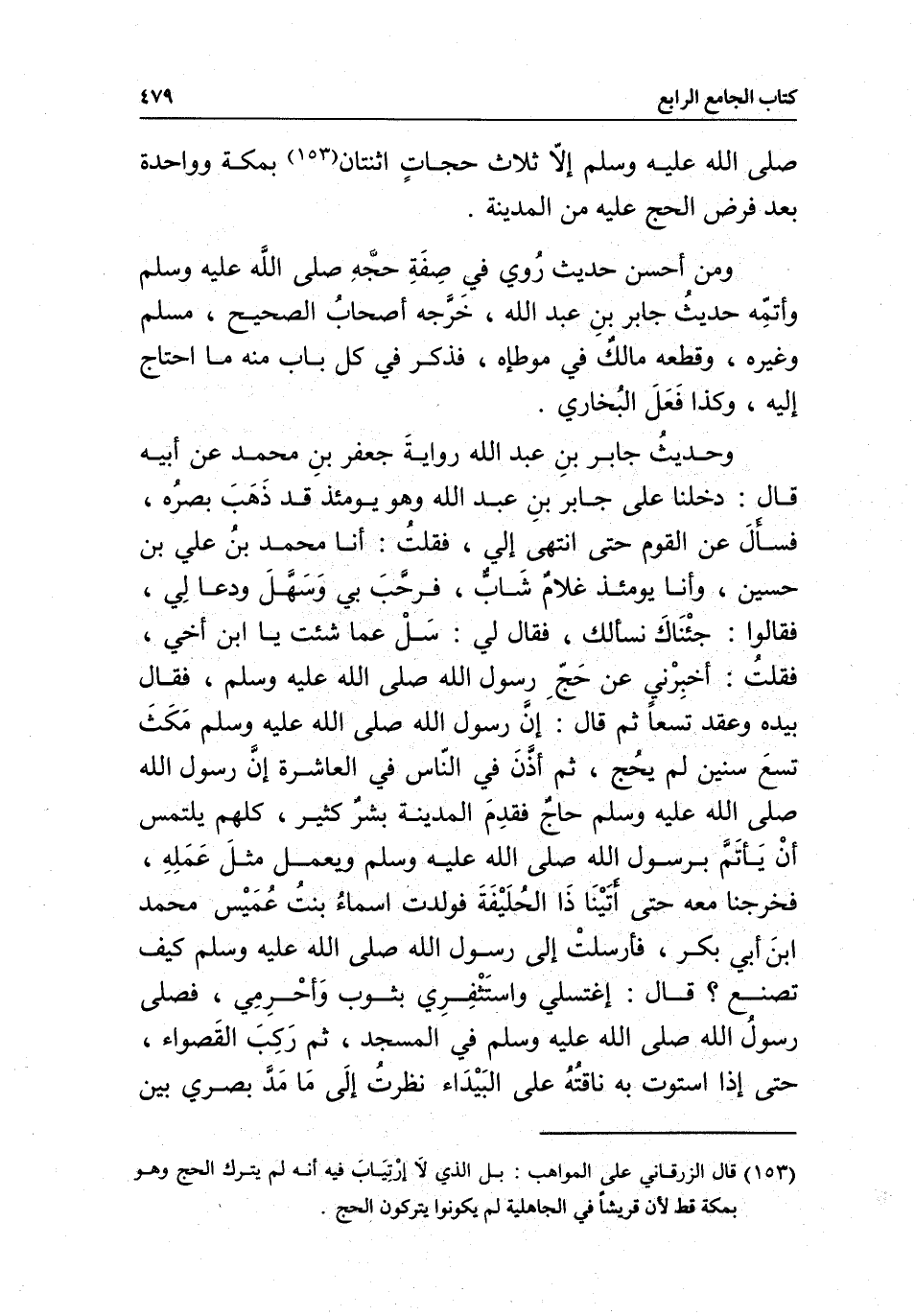 وحديث جابر بن عبد الله رواية جعفر بن محمد عن أبيه، قال: «دخلنا على جابر بن عبد الله وهو يومئذ قد ذهب بصره، فسأل عن القوم حتى انتهى إلي، فقلت: أنا محمد بن علي بن حسين، وأنا يومئذ غلام شاب، فرحب بي وَسَهَّلَ ودعا لي، فقالوا: جئناك نسألك، فقال لي: سل عما شئت يا ابن أخي، فقلت: أخبرني عن حج رسول الله - صَلَّى اللَّهُ عَلَيْهِ وَسَلَّمَ -، فقال بيده وعقد تسعا، ثم قال: إن رسول الله - صَلَّى اللَّهُ عَلَيْهِ وَسَلَّمَ - مكث تسع سنين لم يحج، ثم أذن في الناس في العاشرة: إن رسول الله - صَلَّى اللَّهُ عَلَيْهِ وَسَلَّمَ - حاج فقدم المدينة بشر كثير، كلهم يلتمس أن يأتم برسول الله - صَلَّى اللَّهُ عَلَيْهِ وَسَلَّمَ - ويعمل مثل عمله، فخرجنا معه حتى أتينا ذا الحليفة، فولدت أسماء بنت عميس محمد بن أبي بكر، فأرسلت إلى رسول الله - صَلَّى اللَّهُ عَلَيْهِ وَسَلَّمَ - كيف تصنع؟ قال: اغتسلي واستثفري بثوب وأحرمي، فصلى رسول الله - صَلَّى اللَّهُ عَلَيْهِ وَسَلَّمَ - في المسجد، ثم ركب القصواء، حتى إذا استوت به ناقته على البيداء نظرت إلى ما مد بصري بين