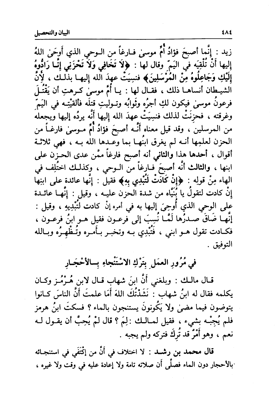 قال محمد بن رشد: لا اختلاف في أن من اكتفي في استنجائه بالأحجار دون الماء فصلى أن صلاته تامة ولا إعادة عليه في وقت ولا غيره؛