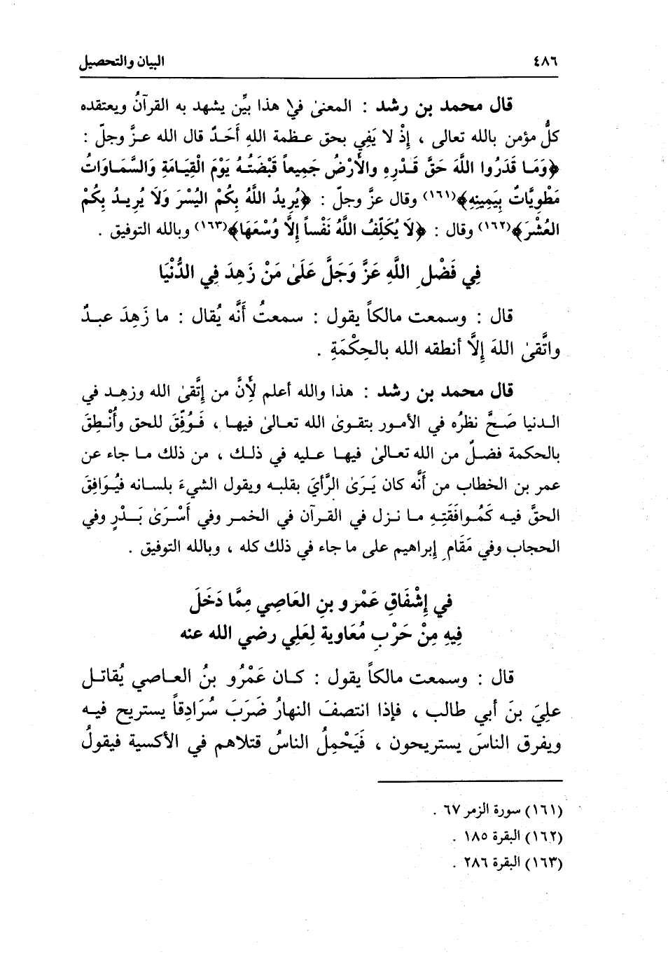 قال محمد بن رشد: المعنى في هذا بين يشهد به القرآن ويعتقده كل مؤمن بالله تعالى، إذ لا يفي بحق عظمة الله أحد، قال الله عز وجل: {وَمَا قَدَرُوا اللَّهَ حَقَّ قَدْرِهِ وَالأَرْضُ جَمِيعًا قَبْضَتُهُ يَوْمَ الْقِيَامَةِ وَالسَّمَاوَاتُ مَطْوِيَّاتٌ بِيَمِينِهِ} [الزمر: 67] ، وقال عز وجل: {يُرِيدُ اللَّهُ بِكُمُ الْيُسْرَ وَلا يُرِيدُ بِكُمُ الْعُسْرَ} [البقرة: 185] ، وقال: {لا يُكَلِّفُ اللَّهُ نَفْسًا إِلا وُسْعَهَا} [البقرة: 286] ، وبالله التوفيق.