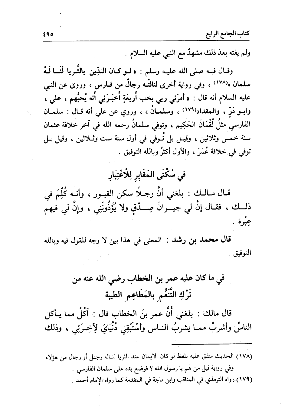 وقال فيه - صَلَّى اللَّهُ عَلَيْهِ وَسَلَّمَ -: «لو كان الدين بالثريا لناله سلمان» ، وفي رواية أخرى: «لنالته رجال من فارس» ، وروي عن النبي - عَلَيْهِ السَّلَامُ - أنه قال: «أمرني ربي بحب أربعة، أخبرني أنه يحبهم: علي، وأبو ذر، والمقداد، وسلمان» ، وروي عن علي أنه قال: سلمان الفارسي مثل لقمان الحكيم، وتوفي سلمان - رَحِمَهُ اللَّهُ - في آخر خلافة عثمان سنة خمس وثلاثين، وقيل: بل توفي في أول سنة ست وثلاثين، وقيل: بل توفي في خلافة عمر، والأول أكثر، وبالله التوفيق.