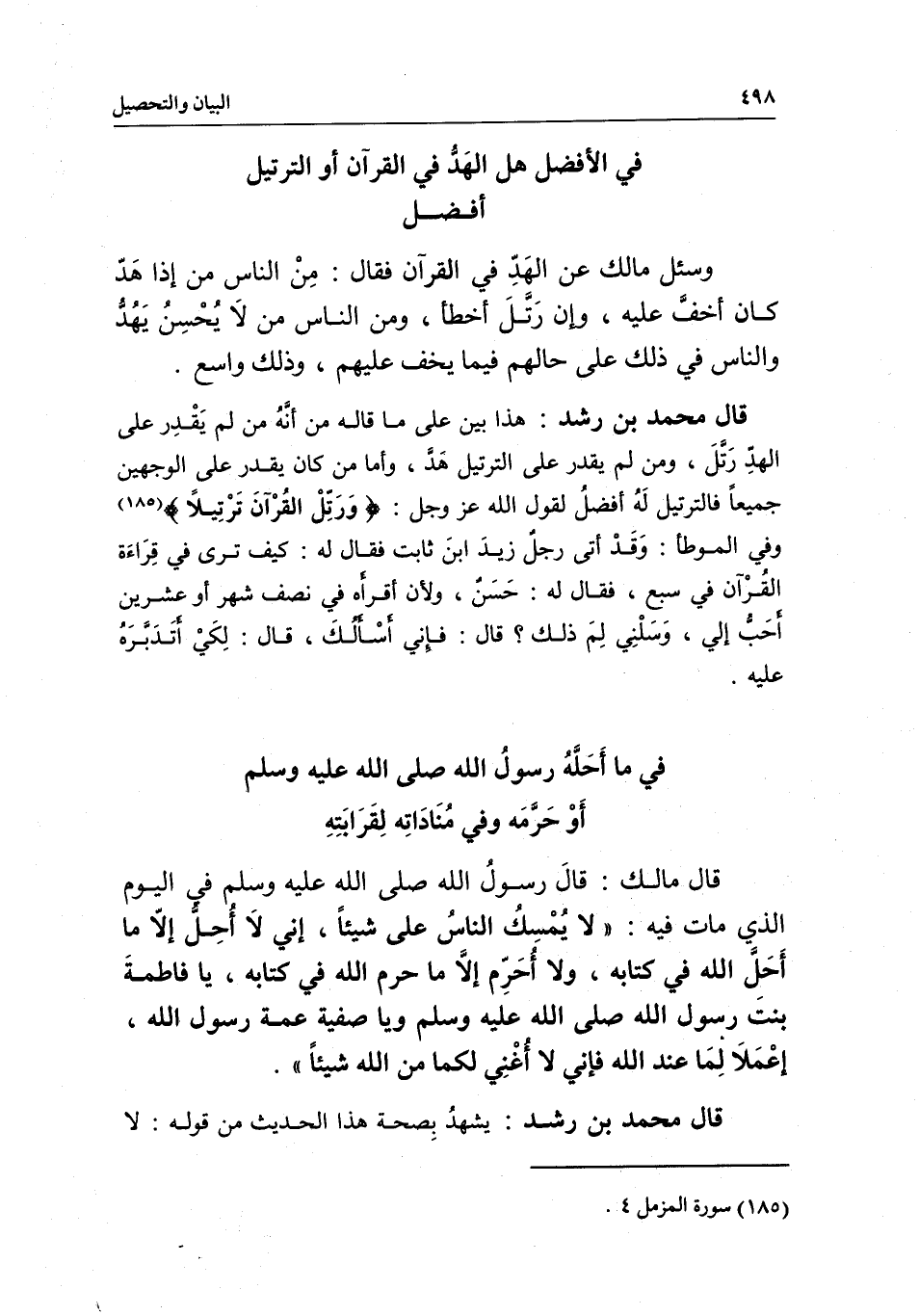 قال محمد بن رشد: هذا بين على ما قاله من أنه من لم يقدر على الهد رتل، ومن لم يقدر على الترتيل هد، وأما من كان يقدر على الوجهين جميعا فالترتيل له أفضل؛ لقول الله عز وجل: {وَرَتِّلِ الْقُرْآنَ تَرْتِيلا} [المزمل: 4] ، وفي الموطأ: وقد أتى رجل زيد بن ثابت، فقال له: كيف ترى في قراءة القرآن في سبع، فقال له: حسن، ولأن أقرأه في نصف شهر أو عشرين أحب إلي، وسلني: لم ذلك؟ قال: فإني أسألك، قال: لكي أتدبره عليه.