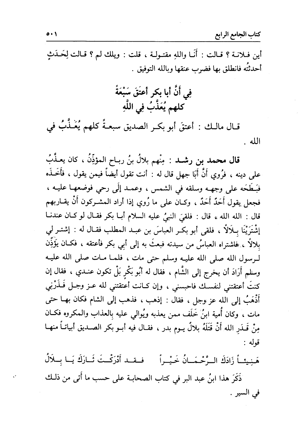 قال محمد بن رشد: منهم بلال بن رباح المؤذن، كان يعذب على دينه، فروي أن أبا جهل قال له: أنت تقول أيضا فيمن يقول، فأخذه فبطحه على وجهه وسلقه في الشمس، وعمد إلى رحى فوضعها عليه، فجعل يقول: أحد أحد، وكان على ما روي: إذا أراد المشركون أن يقاربهم، قال: الله الله، قال: فلقي النبي - عَلَيْهِ السَّلَامُ - أبا بكر، فقال: «لو كان عندنا اشترينا بلالا» ، فلقي أبو بكر العباس بن عبد المطلب، فقال له: اشتر لي بلالا، فاشتراه العباس من سيده، فبعث به إلى أبي بكر فأعتقه، فكان يؤذن لرسول الله - صَلَّى اللَّهُ عَلَيْهِ وَسَلَّمَ - حتى مات، فلما مات - صَلَّى اللَّهُ عَلَيْهِ وَسَلَّمَ - أراد أن يخرج إلى الشام، فقال له أبو بكر: بل تكون عندي، فقال: إن كنت أعتقتني لنفسك فاحبسني، وإن كانت أعتقتني لله عز وجل فذرني أذهب إلى الله عز وجل، فقال: اذهب، فذهب إلى الشام، فكان بها حتى مات، وكان أمية بن خلف ممن يعذبه ويوالي عليه بالعذاب والمكروه، فكان من قدر الله أن قتله بلال يوم بدر، فقال فيه أبو بكر الصديق أبياتا منها قوله: