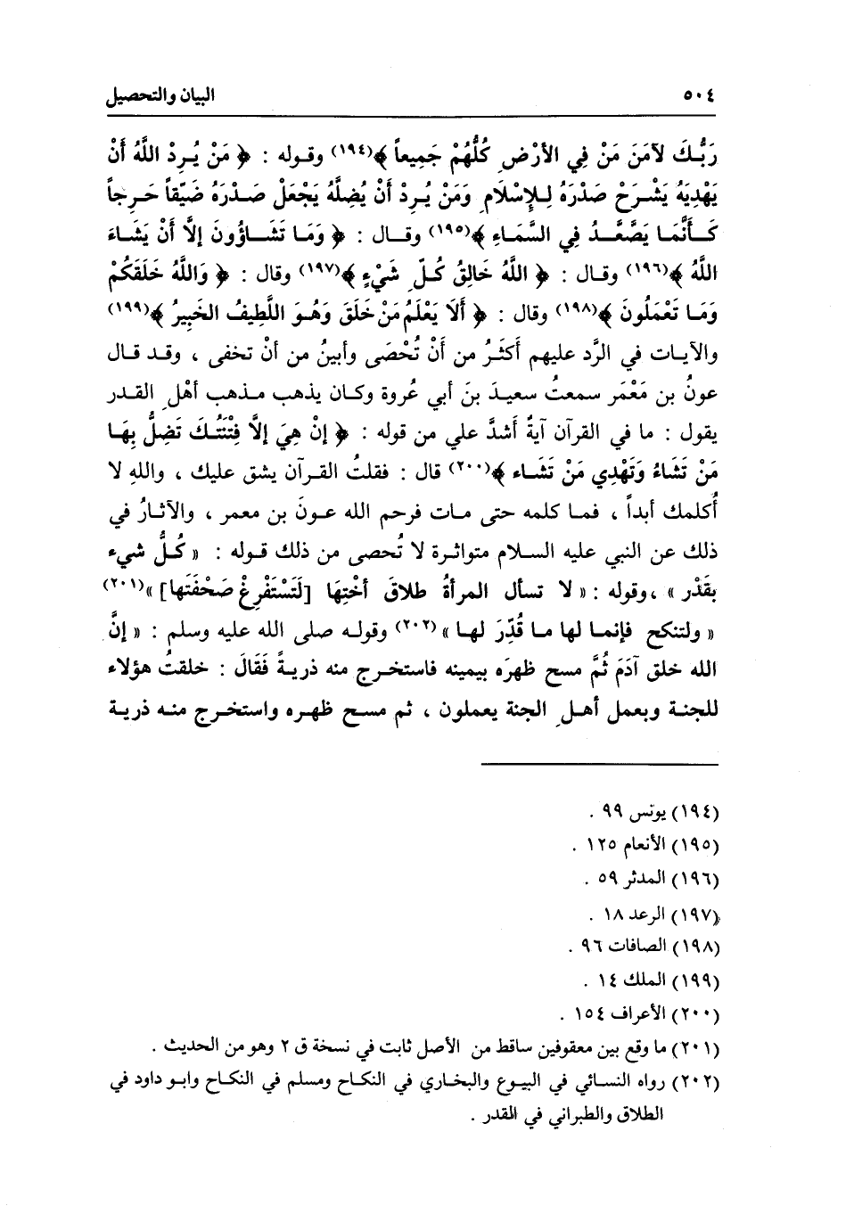 وقوله: {فَمَنْ يُرِدِ اللَّهُ أَنْ يَهْدِيَهُ يَشْرَحْ صَدْرَهُ لِلإِسْلامِ وَمَنْ يُرِدْ أَنْ يُضِلَّهُ يَجْعَلْ صَدْرَهُ ضَيِّقًا حَرَجًا كَأَنَّمَا يَصَّعَّدُ فِي السَّمَاءِ} [الأنعام: 125] ، وقال: {وَمَا تَشَاءُونَ إِلا أَنْ يَشَاءَ اللَّهُ} [الإنسان: 30] ، وقال: {اللَّهُ خَالِقُ كُلِّ شَيْءٍ} [الرعد: 16] ، وقال: {وَاللَّهُ خَلَقَكُمْ وَمَا تَعْمَلُونَ} [الصافات: 96] وقال: {أَلا يَعْلَمُ مَنْ خَلَقَ وَهُوَ اللَّطِيفُ الْخَبِيرُ} [الملك: 14] ، والآيات في الرد عليهم أكثر من أن تحصى وأبين من أن تخفى، وقد قال عون بن معمر: سمعت سعيد بن أبي عروة وكان يذهب مذهب أهل القدر، يقول: ما في القرآن آية أشد علي من قوله: {إِنْ هِيَ إِلا فِتْنَتُكَ تُضِلُّ بِهَا مَنْ تَشَاءُ وَتَهْدِي مَنْ تَشَاءُ} [الأعراف: 155] ، قال: فقلت: القرآن يشق عليك، والله لا أكلمك أبدا، فما كلمه حتى مات، فرحم الله عون ابن معمر، والآثار في ذلك عن النبي - عَلَيْهِ السَّلَامُ - متواترة لا تحصى، من ذلك قوله: «كل شيء بقدر» ، وقوله: «لا تسأل المرأة طلاق أختها [لتستفرغ صحفتها] ، ولتنكح فإنما لها ما قدر لها» ، وقوله - صَلَّى اللَّهُ عَلَيْهِ وَسَلَّمَ -: «إن الله خلق آدم ثم مسح ظهره بيمينه، فاستخرج منه ذرية، فقال: خلقت هؤلاء للجنة وبعمل أهل الجنة يعملون، ثم مسح ظهره واستخرج منه ذرية،