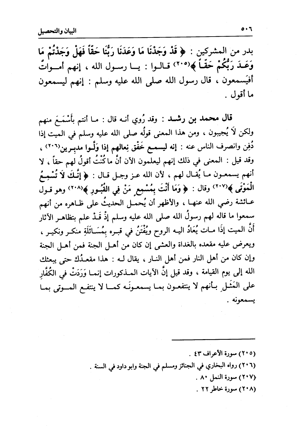 قال محمد بن رشد: وقد روي أنه قال: «ما أنتم بأسمع منهم ولكن لا يجيبون» ، ومن هذا المعنى قوله - صَلَّى اللَّهُ عَلَيْهِ وَسَلَّمَ - في الميت إذا دفن وانصرف الناس عنه: «إنه ليسمع خفق نعالهم إذا ولوا مدبرين» ، وقد قيل: المعنى في ذلك أنهم ليعلمون الآن أن ما كنت أقول لهم حقا، لا أنهم يسمعون ما يقال لهم؛ لأن الله عز وجل قال: {إِنَّكَ لا تُسْمِعُ الْمَوْتَى} [النمل: 80] ، وقال: {وَمَا أَنْتَ بِمُسْمِعٍ مَنْ فِي الْقُبُورِ} [فاطر: 22] ، وهو قول عائشة - رَضِيَ اللَّهُ عَنْهَا -، والأظهر أن يحمل الحديث على ظاهره من أنهم سمعوا ما قاله لهم رسول الله - صَلَّى اللَّهُ عَلَيْهِ وَسَلَّمَ -؛ إذ قد علم بتظاهر الآثار أن الميت إذا مات يعاد إليه الروح ويفتن في قبره بمسائلة منكر ونكير، ويعرض عليه مقعده بالغداة والعشي، إن كان من أهل الجنة فمن أهل الجنة، وإن كان من أهل النار فمن أهل النار، يقال له: هذا مقعدك حتى يبعثك الله إلى يوم القيامة، وقد قيل: إن الآيات المذكورات إنما وردت في الكفار على المثل بأنهم لا ينتفعون بما يسمعونه كما لا ينتفع الموتى بما يسمعونه.