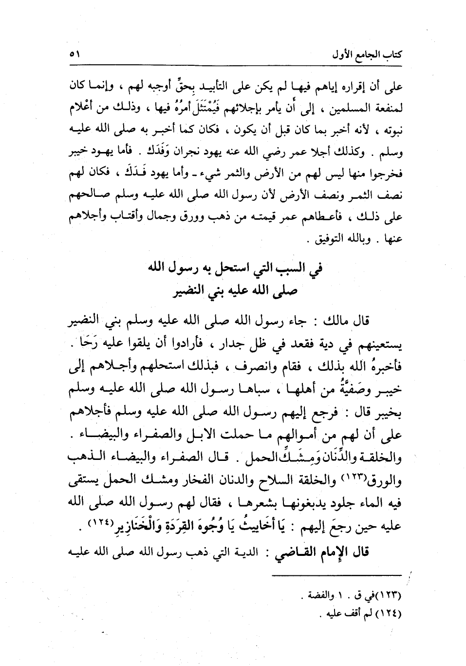 قال مالك: «جاء رسول الله - صَلَّى اللَّهُ عَلَيْهِ وَسَلَّمَ - بني النضير يستعينهم في دية فقعد في ظل جدار، فأرادوا أن يلقوا عليه رَحَا. فأخبرهُ الله بذلك، فقام وانصرف، فبذلك استحلهم وأجلاهم إلى خيبر» وصَفيَّةُ من أهلها، سباها رسول الله - صَلَّى اللَّهُ عَلَيْهِ وَسَلَّمَ - بخيبر، قال: «فرجع إليهم رسول الله - صَلَّى اللَّهُ عَلَيْهِ وَسَلَّمَ - فأجلاهم على أن لهم من أموالهم ما حملت الإبل والصفراء والبيضاء والخلقة والدِّنَان وَمِشَكِّ الحمل» . قال: الصفراء والبيضاء الذهب والورق والخلقة السلاح والدنان الفخار ومشك الحمل يستقي فيه الماء جلود يدبغونها بشعرها، «فقال لهم رسول الله صَلَّى اللَّهُ عَلَيْهِ حين رجعَ إليهم: يَا أخَاييثُ يَا وُجُوهَ القِرَدَةِ وَالْخَنَازِيرِ» .