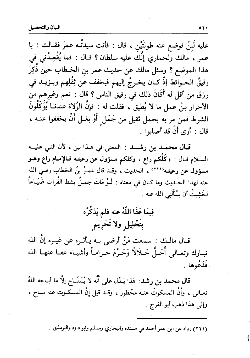 قال محمد بن رشد: المعنى في هذا بين؛ لأن النبي - عَلَيْهِ السَّلَامُ - قال: «كلكم راع، وكلكم مسئول عن رعيته، فالإمام راع وهو مسئول عن رعيته ... » الحديث، وقد قال عمر بن الخطاب - رَضِيَ اللَّهُ عَنْهُ - لهذا الحديث وما كان في معناه: لو مات جمل بشط الفرات ضياعا لخشيت أن يسألني الله عنه.