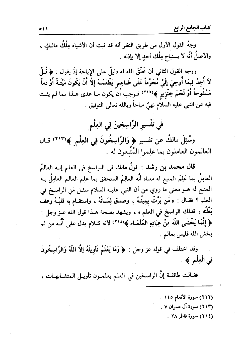في تفسير الراسخين في العلم وسئل مالك: عن تفسير {وَالرَّاسِخُونَ فِي الْعِلْمِ} [آل عمران: 7] ، قال: العالمون العاملون بما علموا المتبعون له.