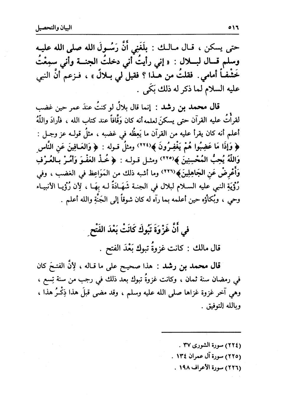 قال محمد بن رشد: هذا صحيح على ما قاله؛ لأن الفتح كان في رمضان سنة ثمان، وكانت غزوة تبوك بعد ذلك في رجب من سنة تسع، وهى آخر غزوة غزاها - صَلَّى اللَّهُ عَلَيْهِ وَسَلَّمَ -، وقد مضى قبل هذا ذكر هذا، وبالله التوفيق.
