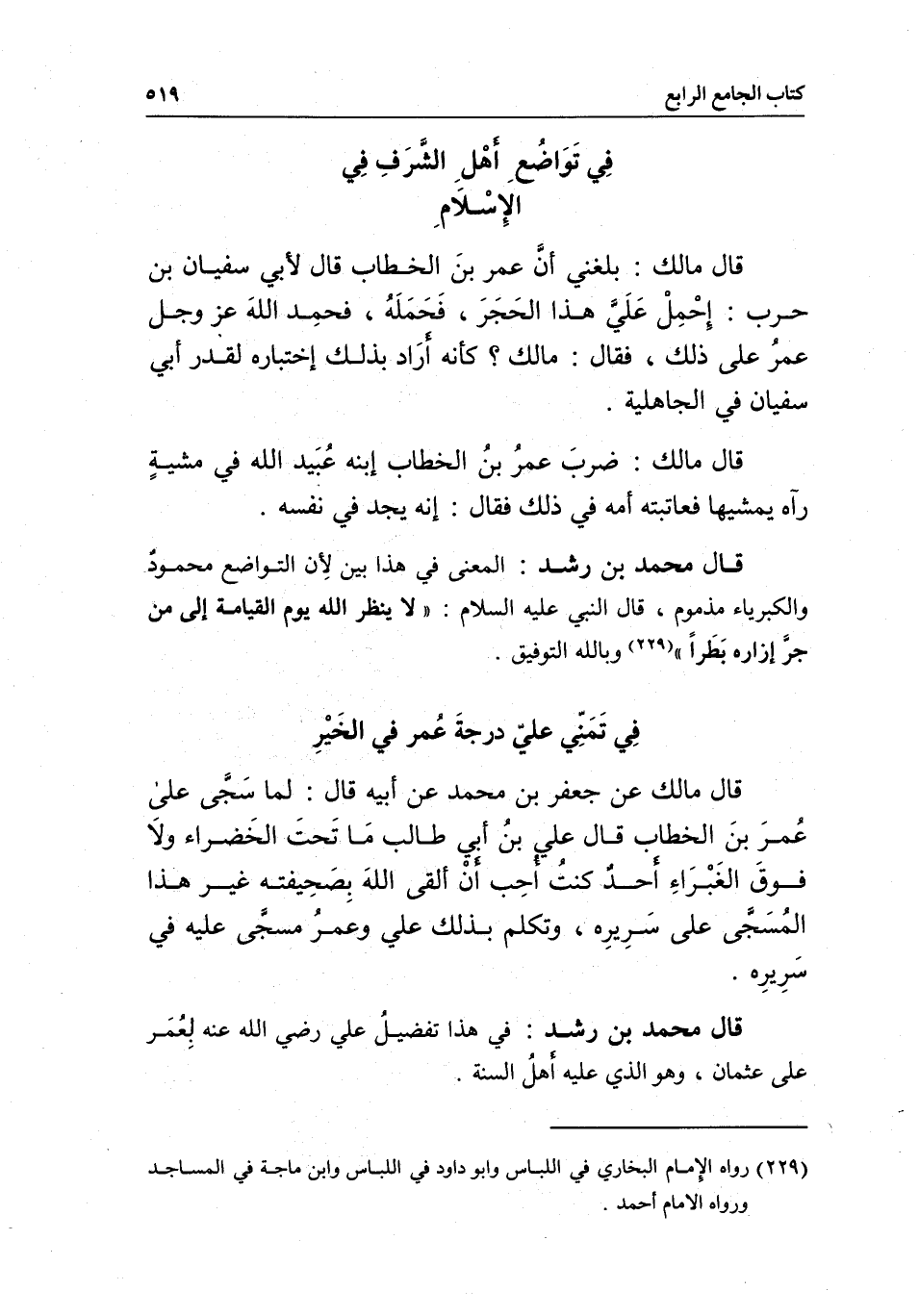 في تمني علي درجة عمر في الخير قال مالك عن جعفر بن محمد عن أبيه قال: لما سجَّى على عمر بن الخطاب قال علي بن أبي طالب: ما تحت الخضراء ولا فوق الغبراء أحد كنت أحب أن ألقى الله بصحيفته غير هذا المسجى على سريره، وتكلم بذلك علي وعمر مسجى عليه في سريره.
