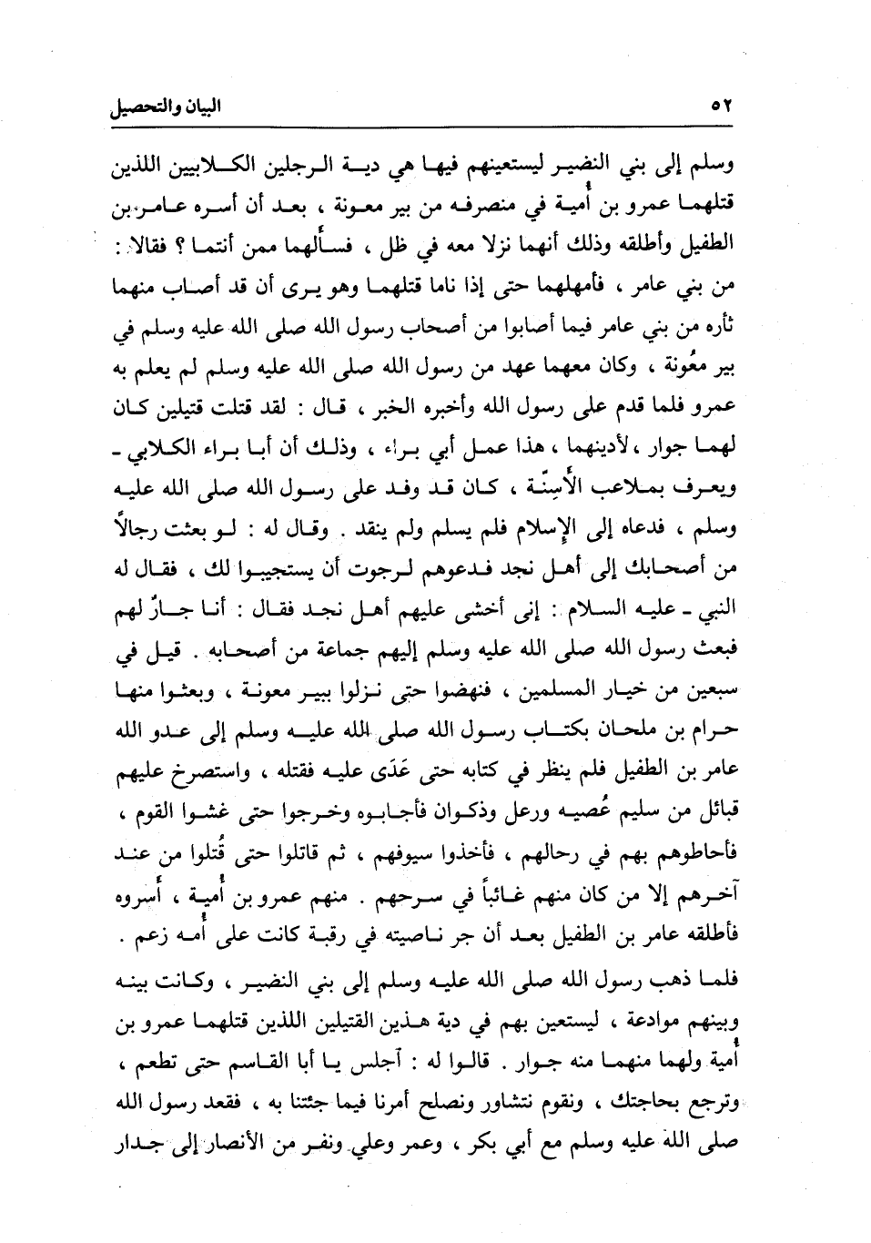 وسلم إلى بني النضير ليستعينهم فيها هي دية الرجلين الكلابيين اللذين قتلهما عمرو بن أمية في منصرفه من بئر معونة، بعد أن أسره عامر بن الطفيل وأطلقه، وذلك أنهما نزلا معه في ظل، فسألهما: ممن أنتما؟ فقالا: من بني عامر، فأمهلهما حتى إذا ناما قتلهما وهو يرى أن قد أصاب منهما ثأره من بني عامر فيما أصابوا من أصحاب رسول الله - صَلَّى اللَّهُ عَلَيْهِ وَسَلَّمَ - في بئر معُونة، وكان معهما عهد من رسول الله - صَلَّى اللَّهُ عَلَيْهِ وَسَلَّمَ - لم يعلم به عمرو فلما قدم على رسول الله وأخبره الخبر، قال: لقد قتلت قتيلين كان لهما جوار، لأدينهما، هذا عمل أبي براء، وذلك أن أبا براء الكلابي، ويعرف بملاعب الأسِنّة، كان قد وفد على رسول الله - صَلَّى اللَّهُ عَلَيْهِ وَسَلَّمَ -، فدعاه إلى الِإسلام فلم يسلم ولم ينقد. وقال له: لو بعثت رجالَاَ من أصحابك إلى أهل نجد فدعوهم لرجوت أن يستجيبوا لك، فقال له النبي- عَلَيْهِ السَّلَامُ -: إني أخشى عليهم أهل نجد، فقال: أنا جارٌ لهم، فبعث رسول الله - صَلَّى اللَّهُ عَلَيْهِ وَسَلَّمَ - إليهم جماعة من أصحابه، قيل: في سبعين من خيار المسلمين، فنهضوا حتى نزلوا ببئر معونة، وبعثوا منها حرام بن ملحان بكتاب رسول الله - صَلَّى اللَّهُ عَلَيْهِ وَسَلَّمَ - إلى عدو الله عامر بن الطفيل فلم ينظر في كتابه حتى عَدَى عليه فقتله، واستصرخ عليهم قبائل من سليم عُصية ورعل وذكوان فأجابوه وخرجوا حتى غشوا القوم، فأحاطوا بهم في رحالهم، فأخذوا سيوفهم، ثم قاتلوا حتى قُتلوا من عند آخرهم إلا من كان منهم غائباً في سرحهم.