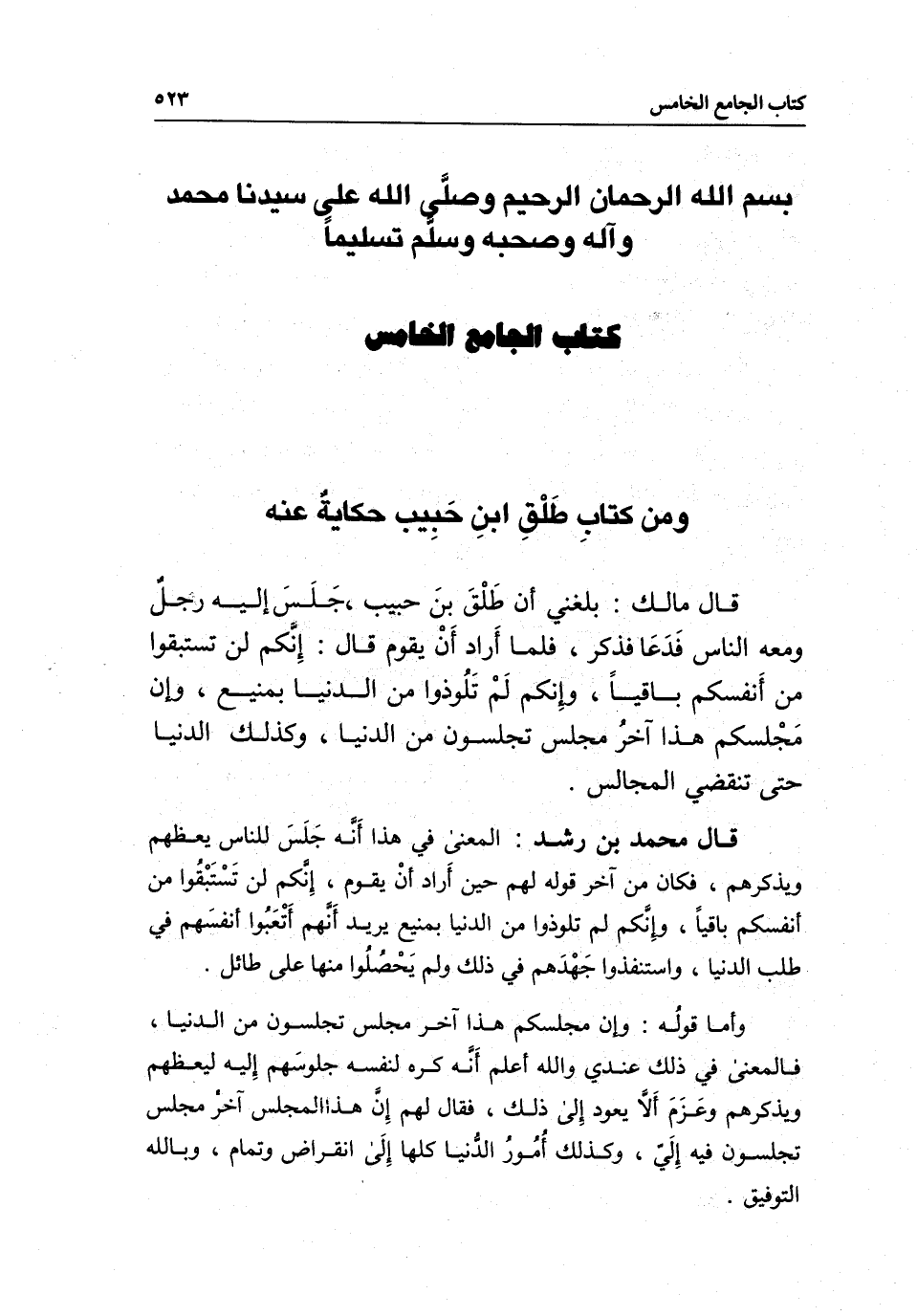 كتاب الجامع الخامس ومن كتاب طلق بن حبيب حكاية عنه قال مالك: بلغني أن طلق بن حبيب، جلس إليه رجل ومعه الناس فدعا فذكر، فلما أراد أن يقوم قال: إنكم لن تستبقوا من أنفسكم باقيا، وإنكم لم تلوذوا من الدنيا بمنيع، وإن مجلسكم هذا آخر مجلس تجلسون من الدنيا، وكذلك الدنيا حتى تنقضي المجالس.