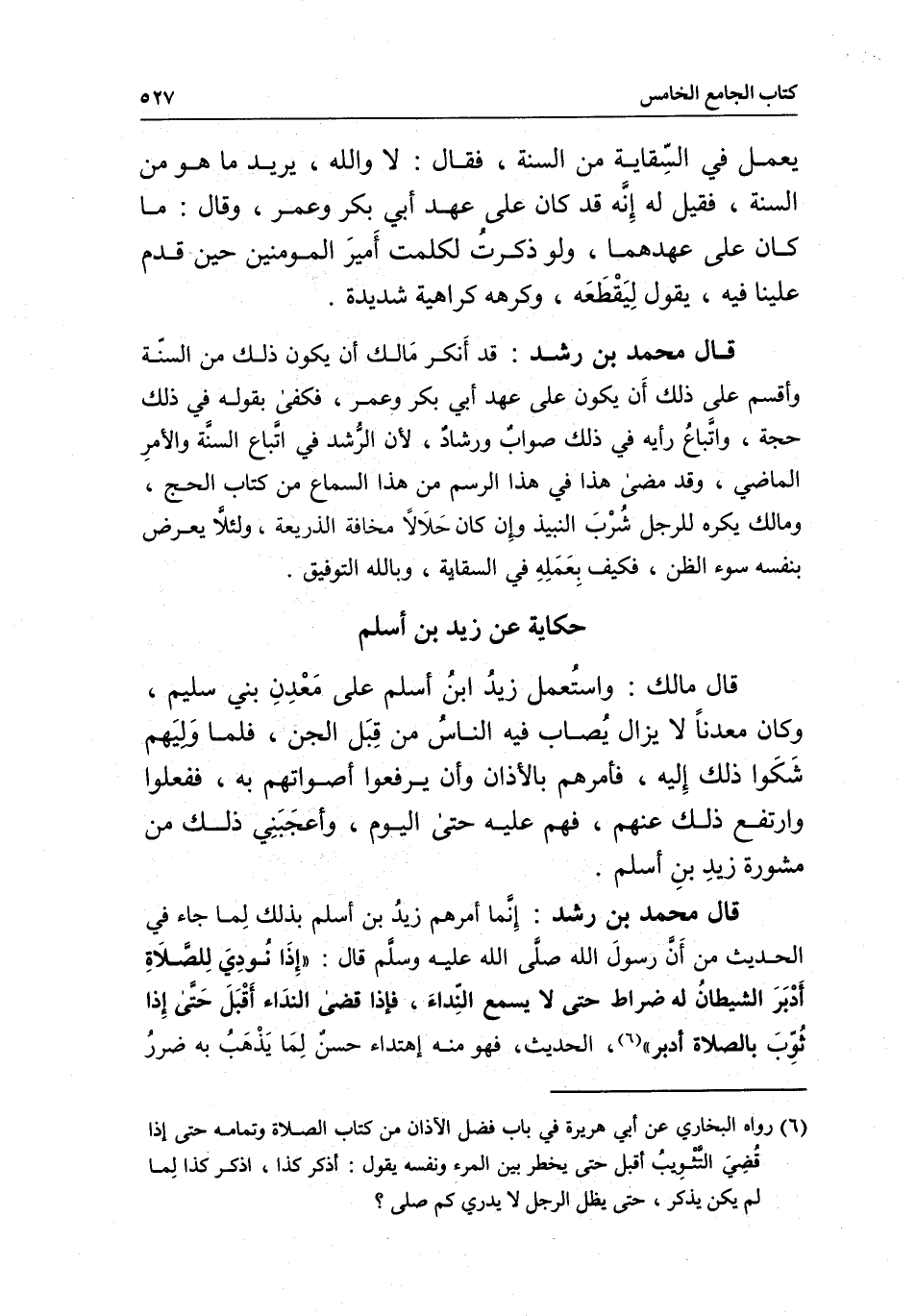 يعمل في السقاية من السنة، فقال: لا والله، يريد ما هو من السنة، فقيل له: إنه قد كان على عهد أبي بكر وعمر، وقال: ما كان على عهدهما، ولو ذكرت لكلمت أمير المؤمنين حين قدم علينا فيه، يقول: ليقطعه، وكرهه كراهية شديدة.