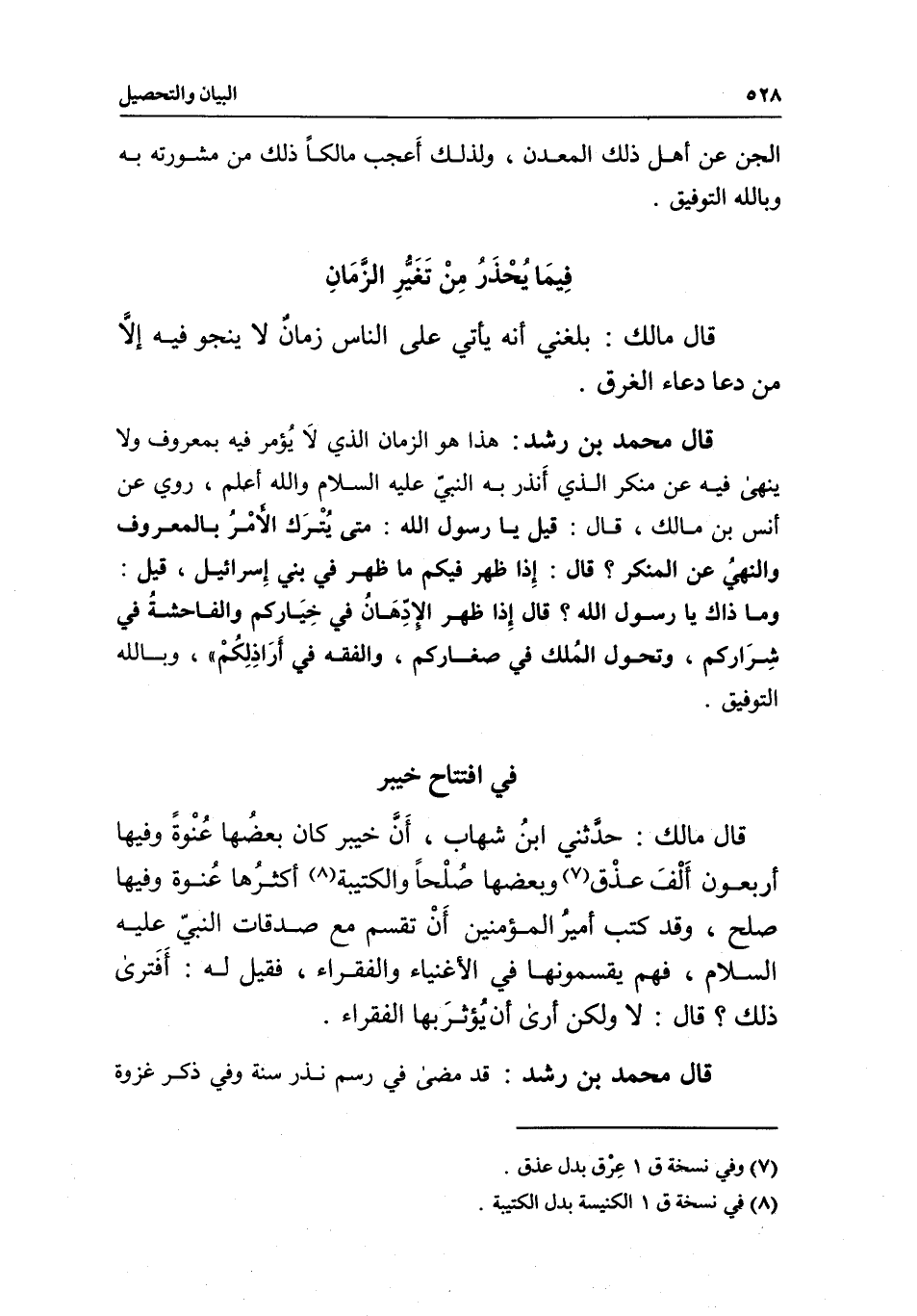 قال مالك: حدثني ابن شهاب، أن خيبر كان بعضها عنوة وفيها أربعون ألف عذق، وبعضها صلحا، والكتيبة أكثرها عنوة وفيها صلح، وقد كتب أمير المؤمنين أن تقسم مع صدقات النبي عليه السلام، فهم يقسمونها في الأغنياء والفقراء، فقيل له: أفترى ذلك؟ قال: لا، ولكن أرى أن يؤثر بها الفقراء.