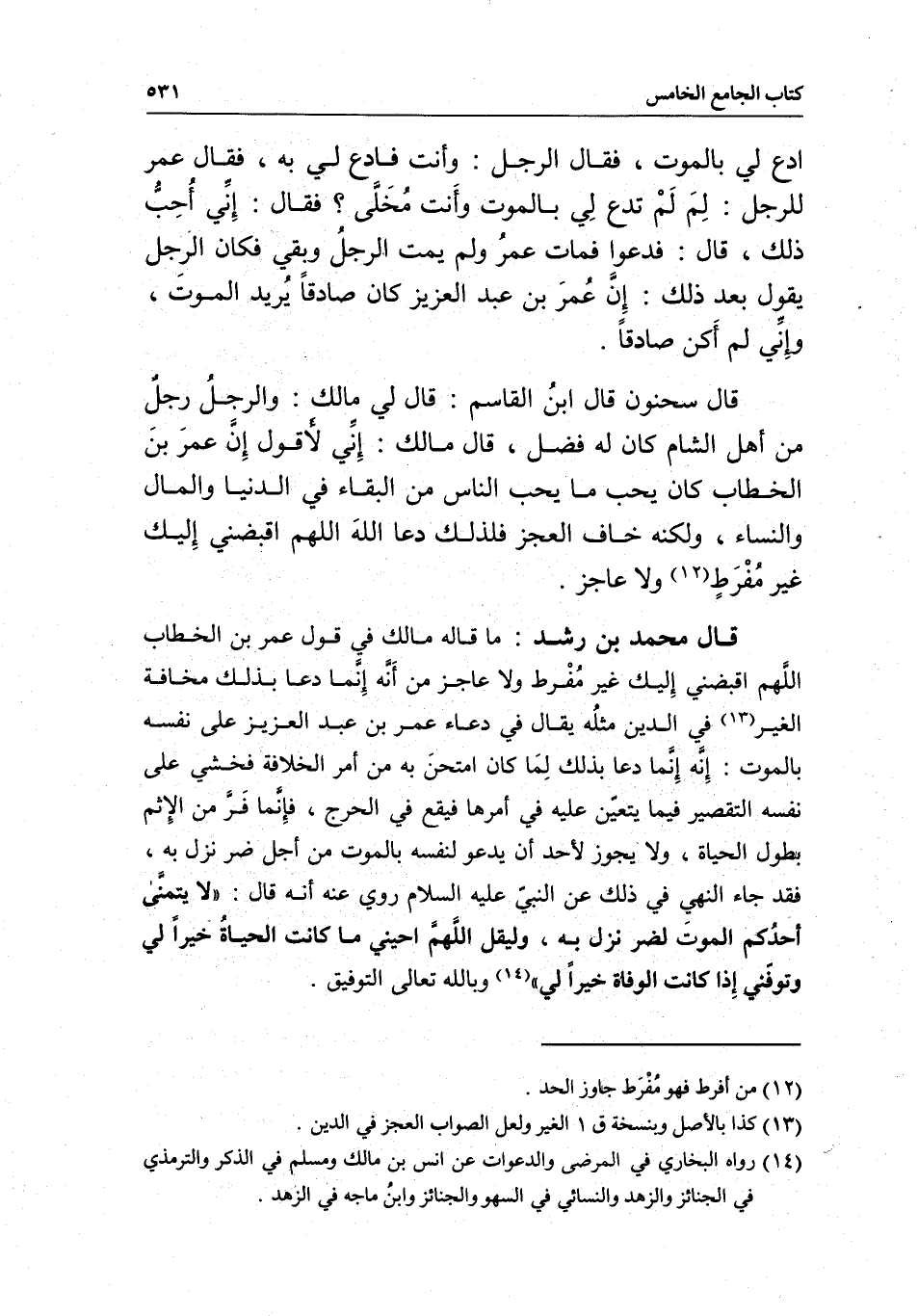 قال سحنون قال ابن القاسم: قال لي مالك: والرجل رجل من أهل الشام كان له فضل، قال مالك: إني لأقول إن عمر بن الخطاب كان يحب ما يحب الناس من البقاء في الدنيا والمال والنساء، ولكنه خاف العجز فلذلك دعا الله اللهم اقبضني إليك غير مفرط ولا عاجز.