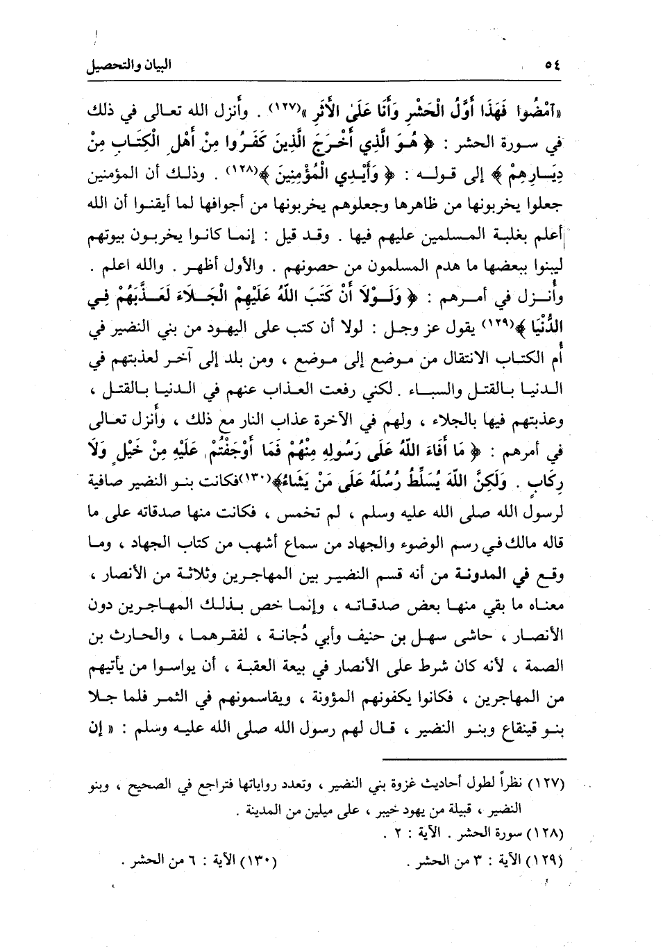 وأنزل تعالى في أمرهم: {وَمَا أَفَاءَ اللَّهُ عَلَى رَسُولِهِ مِنْهُمْ فَمَا أَوْجَفْتُمْ عَلَيْهِ مِنْ خَيْلٍ وَلا رِكَابٍ وَلَكِنَّ اللَّهَ يُسَلِّطُ رُسُلَهُ عَلَى مَنْ يَشَاءُ} [الحشر: 6] فكانت بنو النضير صافية لرسول الله - صَلَّى اللَّهُ عَلَيْهِ وَسَلَّمَ -، لم تخمس، فكانت منها صدقاتَه، على ما قاله مالك في رسم الوضوء والجهاد من سماع أشهب من كتاب الجهاد، وما وقع في المدونة من أنه قسم النضير بين المهاجرين وثلاثة من الأنصار، معناه: ما بقي منها بعض صدقاته، وإنما خص بذلك المهاجرين دون الأنصار، حاشى سهل بن حنيف وأبي دُجانة، لفقرهما، والحارث بن الصمة؛ لأنه كان شرط على الأنصار في بيعة العقبة أن يواسوا من يأتيهم من المهاجرين، فكانوا يكفونهم المئونة، ويقاسمونهم في الثمر فلما جلا بنو قينقاع وبنو النضير، قال لهم رسول الله - صَلَّى اللَّهُ عَلَيْهِ وَسَلَّمَ -: «إن