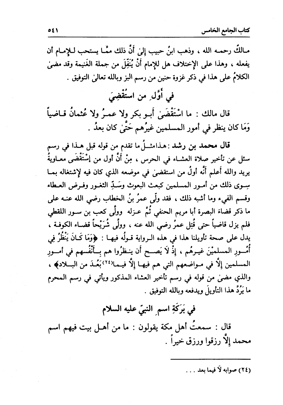 في أول من استقضي قال مالك: ما استقضى أبو بكر ولا عمر ولا عثمان قاضيا وما كان ينظر في أمور المسلمين غيرهم حتى كان بعد.