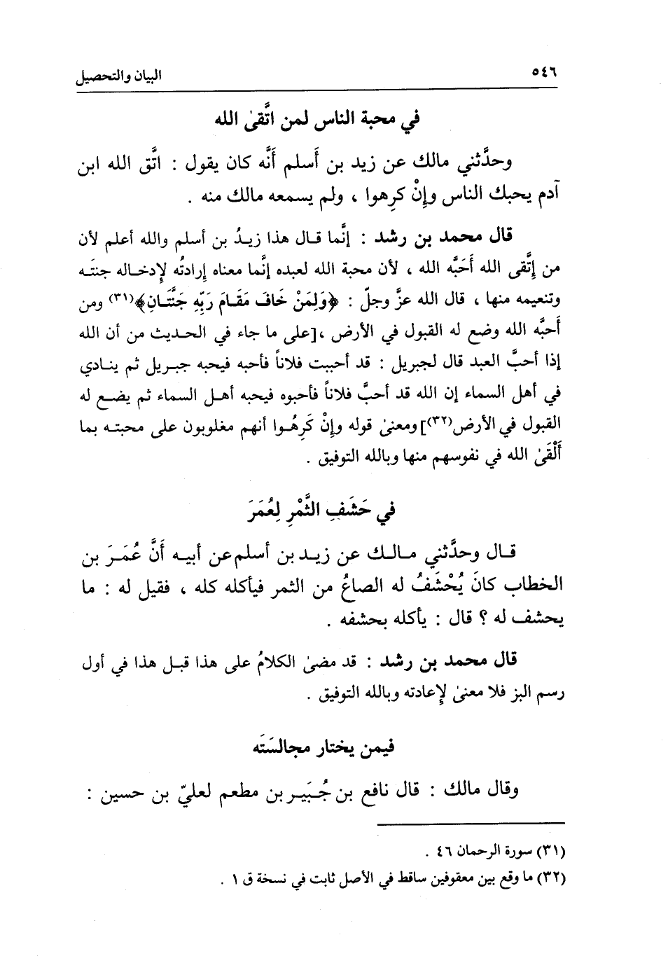 فيمن يختار مجالسته وقال مالك: قال نافع بن جبير بن مطعم لعلي بن حسين: