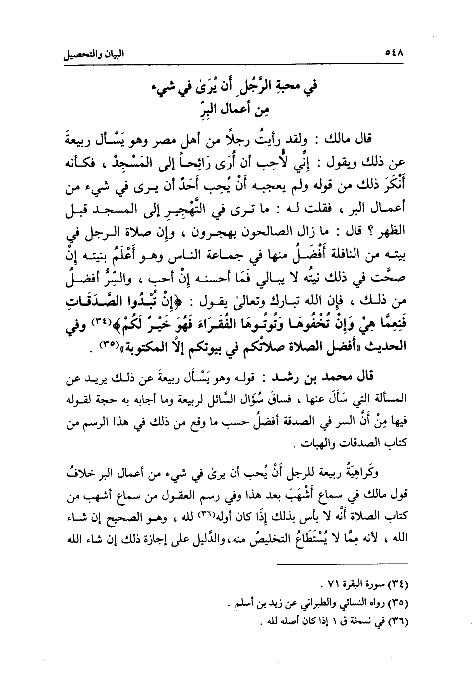 من أعمال البر قال مالك: ولقد رأيت رجلا من أهل مصر وهو يسأل ربيعة عن ذلك ويقول: إني لأحب أن أرى رائحا إلى المسجد، فكأنه أنكر ذلك من قوله ولم يعجبه أن يحب أحد أن يرى في شيء من أعمال البر، فقلت له: ما ترى في التهجير إلى المسجد قبل الظهر؟ قال: ما زال الصالحون يهجرون، وإن صلاة الرجل في بيته من النافلة أفضل منها في جماعة الناس وهو أعلم بنيته إن صحت في ذلك نيته لا يبالي فما أحسنه إن أحب، والسر أفضل من ذلك، فإن الله تبارك وتعالى يقول: {إِنْ تُبْدُوا الصَّدَقَاتِ فَنِعِمَّا هِيَ وَإِنْ تُخْفُوهَا وَتُؤْتُوهَا الْفُقَرَاءَ فَهُوَ خَيْرٌ لَكُمْ} [البقرة: 271] وفي الحديث «أفضل الصلاة صلاتكم في بيوتكم إلا المكتوبة» .