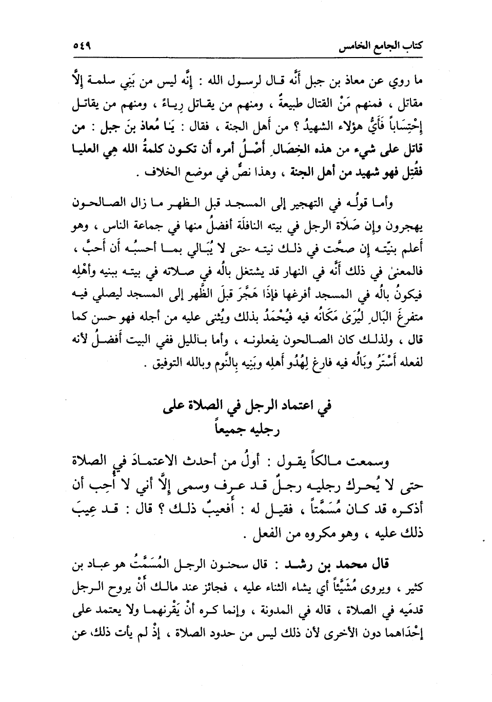 رجليه جميعا وسمعت مالكا يقول: أول من أحدث الاعتماد في الصلاة حتى لا يحرك رجليه رجل قد عرف وسمي إلا أني لا أحب أن أذكره قد كان مسمتا، فقيل له: أفعيب ذلك؟ قال: قد عيب ذلك عليه، وهو مكروه من الفعل.