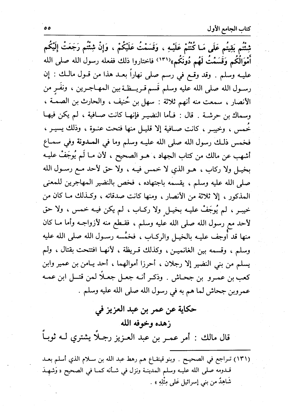 شِئْتُم بَقِيتُم عَلَى مَا كُنْتُمْ عَلَيْهِ، وَقَسَمْتُ عَلَيْكُمْ، وَإِنْ شِئْتُم رَجَعَتْ إِلَيْكُم أمْوَالُكُم وَقَسَمْتُ لَهُم دونَكُم» فاختاروا ذلك ففعله رسول الله - صَلَّى اللَّهُ عَلَيْهِ وَسَلَّمَ -. وقد وقع في رسم صلى نهاراً بعد هذا من قول مالك: إِن رسول الله - صَلَّى اللَّهُ عَلَيْهِ وَسَلَّمَ - قَسم قريظة بين المهاجرين، ونفَرٍ من الأنصار، سمعت منه أنهم ثلاثة: سهل بن حُنيف، والحارث بن الصمة، وسماك بن حرشة. قال: فأما النضير فإنها كانت صافية، لم يكن فيها خُمس، وخيبر، كانت صافية إلا قليل منها فتحت عنوة، وذلك يسير، فخمس ذلك رسول الله - صَلَّى اللَّهُ عَلَيْهِ وَسَلَّمَ - وما في المدونة وفي سماع أشهب عن مالك من كتاب الجهاد هو الصحيح؛ لأن ما لَم يُوجَفْ عليه بخيل ولا ركاب، هو الذي لا خمس فيه، ولا حق لأحد مع رسول الله - صَلَّى اللَّهُ عَلَيْهِ وَسَلَّمَ -، يقسمه باجتهاده، فخص بالنضير المهاجرين للمعنى المذكور، إلا ثلاثة من الأنصار، ومنها كانت صدقاته، وكذلك ما كان من خيبر، لم يُوجَفْ عليه بخيلٍ ولا ركاب، لم يكن فيه خمس، ولا حق لأحد مع رسول الله - صَلَّى اللَّهُ عَلَيْهِ وَسَلَّمَ -، فقطع منه لأزواجه، وأما ما كان منها قد أوجف عليه بالخيل والركاب، فخمَسه رسول الله - صَلَّى اللَّهُ عَلَيْهِ وَسَلَّمَ -، وقسمه بين الغانمين، وكذلك قريظة؛ لأنها افتتحت بقتال، ولم يسلم من بني النضير إلا رجلان، أحرزا أموالهما، أحدهما يامن بن عمير وابن كعب بن عمرو بن جحاش. وذكر أنه جعل جعلاً لمن قتل ابن عمه عمرو بن جحاش لما هم به في رسول الله - صَلَّى اللَّهُ عَلَيْهِ وَسَلَّمَ -.