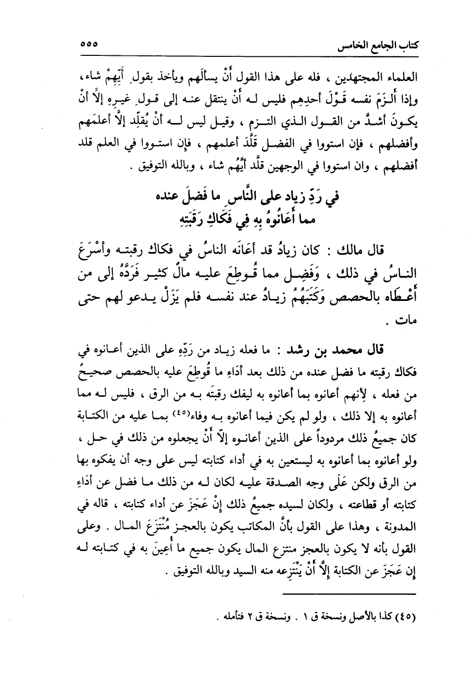 قال محمد بن رشد: ما فعله زياد من رده على الذين أعانوه في فكاك رقبته ما فضل عنده من ذلك بعد أداء ما قوطع عليه بالحصص صحيح من فعله؛ لأنهم أعانوه بما أعانوه به ليفك رقبته به من الرق، فليس له مما أعانوه به إلا ذلك، ولو لم يكن فيما أعانوه به وفاء بما عليه من الكتابة كان جميع ذلك مردودا على الذين أعانوه إلا أن يجعلوه من ذلك في حل، ولو أعانوه بما أعانوه به ليستعين به في أداء كتابته ليس على وجه أن يفكوه بها من الرق ولكن على وجه الصدقة عليه لكان له من ذلك ما فضل عن أداء كتابته أو قطاعته، ولكان لسيده جميع ذلك إن عجز عن أداء كتابته، قاله في المدونة، وهذا على القول بأن المكاتب يكون بالعجز منتزع المال. وعلى القول بأنه لا يكون بالعجز منتزع المال يكون جميع ما أعين به في كتابته له إن عجز عن الكتابة إلا أن ينتزعه منه السيد، وبالله التوفيق.