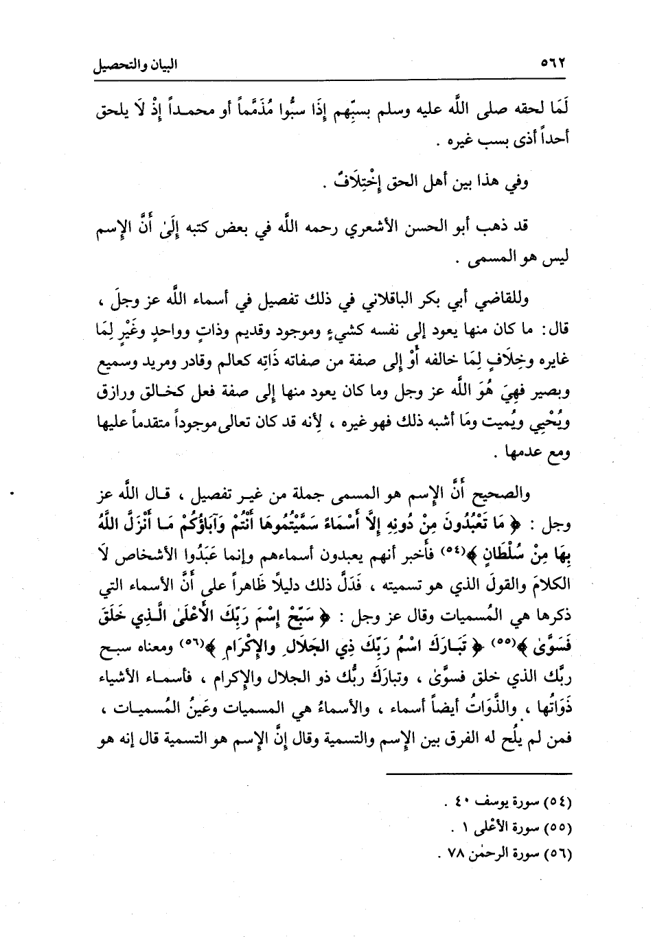 والصحيح أن الاسم هو المسمى جملة من غير تفصيل، قال الله عز وجل: {مَا تَعْبُدُونَ مِنْ دُونِهِ إِلا أَسْمَاءً سَمَّيْتُمُوهَا أَنْتُمْ وَآبَاؤُكُمْ مَا أَنْزَلَ اللَّهُ بِهَا مِنْ سُلْطَانٍ} [يوسف: 40] فأخبر أنهم يعبدون أسماءهم وإنما عبدوا الأشخاص لا الكلام، والقول الذي هو تسميته، فدل ذلك دليلا ظاهرا على أن الأسماء التي ذكرها هي المسميات، وقال عز وجل: {سَبِّحِ اسْمَ رَبِّكَ الأَعْلَى} [الأعلى: 1] {الَّذِي خَلَقَ فَسَوَّى} [الأعلى: 2] ، {تَبَارَكَ اسْمُ رَبِّكَ ذِي الْجَلالِ وَالإِكْرَامِ} [الرحمن: 78] ومعناه سبح ربك الذي خلق فسوى، وتبارك ربك ذو الجلال والإكرام، فأسماء الأشياء ذواتها، والذوات أيضا أسماء، والأسماء هي المسميات وعين المسميات، فمن لم يلح له الفرق بين الاسم والتسمية وقال: إن الاسم هو التسمية قال: إنه هو