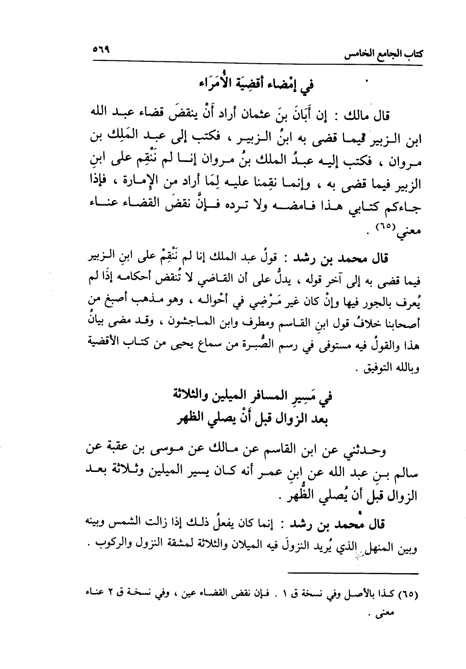 في إمضاء أقضية الأمراء قال مالك: إن أبان بن عثمان أراد أن ينقض قضاء عبد الله بن الزبير فيما قضى به ابن الزبير، فكتب إلى عبد الملك بن مروان، فكتب إليه عبد الملك بن مروان: إنا لم ننقم على ابن الزبير فيما قضى به، وإنما نقمنا عليه لما أراد من الإمارة، فإذا جاءكم كتابي هذا فَأَمْضِه ولا ترده فإن نقض القضاء عناء معني.