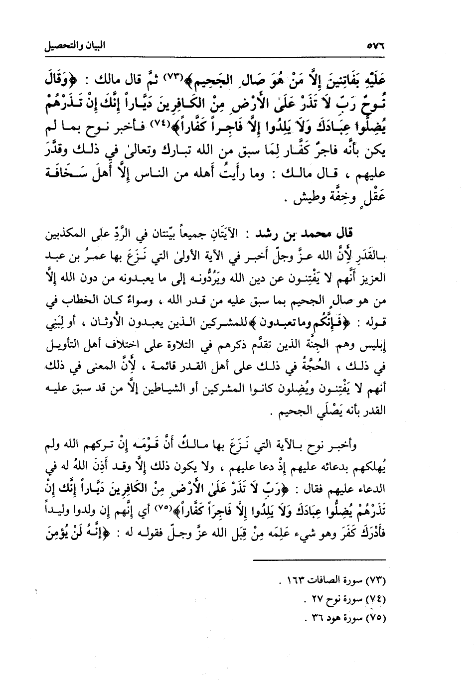 قال محمد بن رشد: الآيتان جميعا بينتان في الرد على المكذبين بالقدر لأن الله عز وجل أخبر في الآية الأولى التي نزع بها عمر بن عبد العزيز أنهم لا يفتنون عن دين الله ويردونه إلى ما يعبدونه من دون الله إلا من هو صال الجحيم بما سبق عليه من قدر الله، وسواء كان الخطاب في قوله: {فَإِنَّكُمْ وَمَا تَعْبُدُونَ} [الصافات: 161] للمشركين الذين يعبدون الأوثان، أو لبني إبليس وهم الجنة الذين تقدم ذكرهم في التلاوة على اختلاف أهل التأويل في ذلك، الحجة في ذلك على أهل القدر قائمة؛ لأن المعنى في ذلك أنهم لا يفتنون ويضلون كانوا المشركين أو الشياطين إلا من قد سبق عليه القدر بأنه يصلى الجحيم.