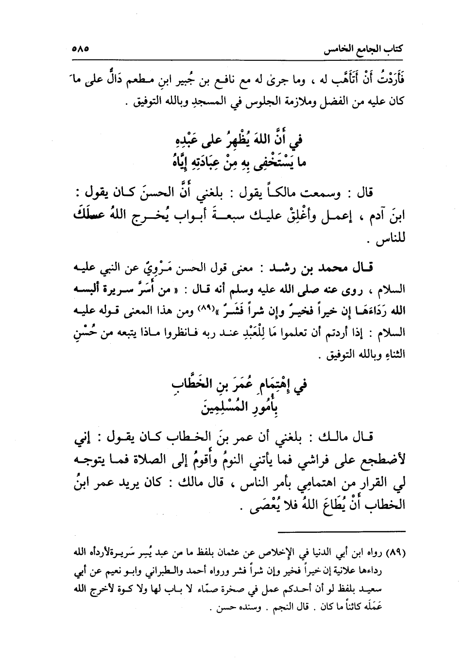 بأمور المسلمين قال مالك: بلغني أن عمر بن الخطاب كان يقول: إني لأضطجع على فراشي فما يأتني النوم وأقوم إلى الصلاة فما يتوجه لي القرار من اهتمامي بأمر الناس، قال مالك: كان يريد عمر ابن الخطاب أن يطاع الله فلا يعصى.