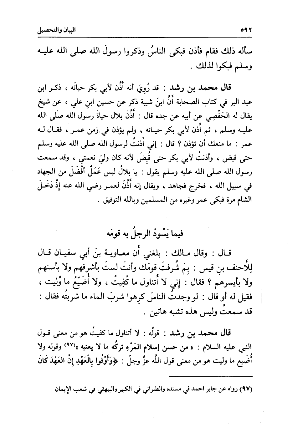 قال محمد بن رشد: قد روي أنه أذن لأبي بكر حياته، ذكر ابن عبد البر في كتاب الصحابة أن ابن شيبة ذكر عن حسين بن علي، عن شيخ يقال له الحفصي عن أبيه عن جده قال: أذن بلال حياة رسول الله صلى الله عليه وسلم، ثم أذن لأبي بكر حياته، ولم يؤذن في زمن عمر، فقال له عمر: ما منعك أن تؤذن؟ قال: إني أذنت لرسول الله - صَلَّى اللَّهُ عَلَيْهِ وَسَلَّمَ - حتى قبض، وأذنت لأبي بكر حتى قبض لأنه كان ولي نعمتي، وقد سمعت رسول الله - صَلَّى اللَّهُ عَلَيْهِ وَسَلَّمَ - يقول: «يا بلال ليس عمل أفضل من الجهاد في سبيل الله، فخرج فجاهد» ويقال إنه أذن لعمر - رَضِيَ اللَّهُ عَنْهُ - إذ دخل الشام مرة فبكى عمر وغيره من المسلمين، وبالله التوفيق.