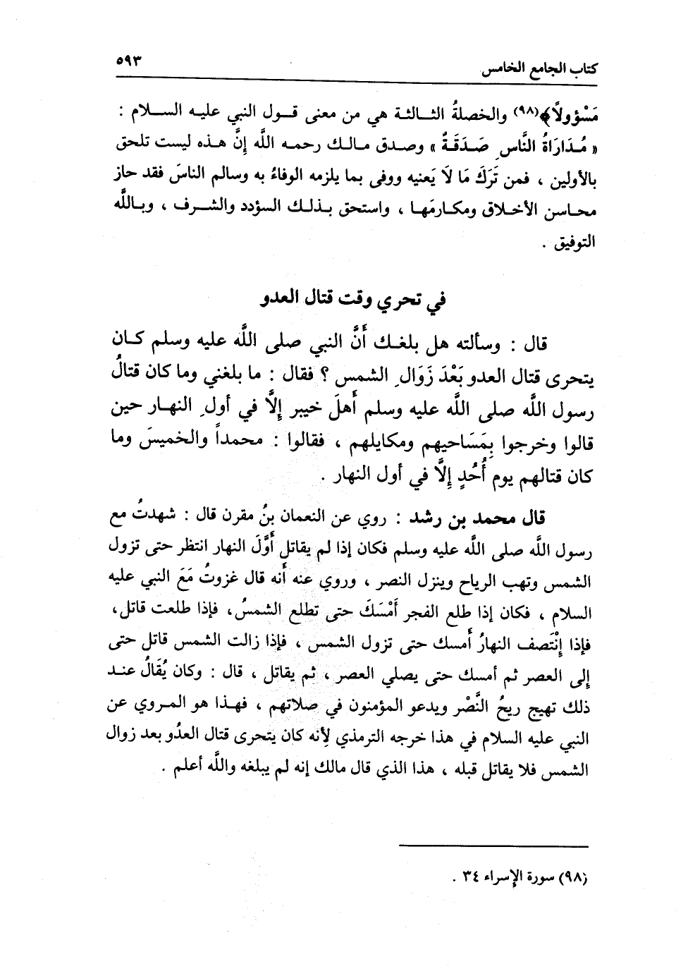 في تحري وقت قتال العدو قال: وسألته هل بلغك أن النبي - صَلَّى اللَّهُ عَلَيْهِ وَسَلَّمَ - كان يتحرى قتال العدو بعد زوال الشمس؟ فقال: ما بلغني وما كان قتال رسول الله - صَلَّى اللَّهُ عَلَيْهِ وَسَلَّمَ - أهل خيبر إلا في أول النهار حين قالوا وخرجوا بمساحيهم ومكايلهم، فقالوا: محمدا والخميس وما كان قتالهم يوم أحد إلا في أول النهار.