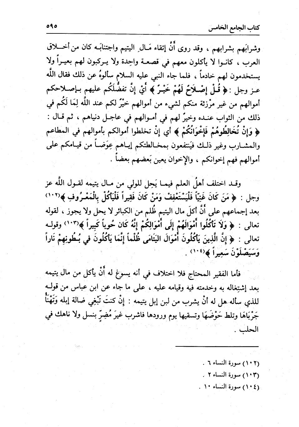 وقد اختلف أهل العلم فيما يحل للولي من مال يتيمه لقول الله عز وجل: {وَمَنْ كَانَ غَنِيًّا فَلْيَسْتَعْفِفْ وَمَنْ كَانَ فَقِيرًا فَلْيَأْكُلْ بِالْمَعْرُوفِ} [النساء: 6] ، بعد إجماعهم على أن أكل مال اليتيم ظلم من الكبائر لا يحل ولا يجوز، لِقَوْلِهِ تَعَالَى: {وَلا تَأْكُلُوا أَمْوَالَهُمْ إِلَى أَمْوَالِكُمْ إِنَّهُ كَانَ حُوبًا كَبِيرًا} [النساء: 2] وقَوْله تَعَالَى: {إِنَّ الَّذِينَ يَأْكُلُونَ أَمْوَالَ الْيَتَامَى ظُلْمًا إِنَّمَا يَأْكُلُونَ فِي بُطُونِهِمْ نَارًا وَسَيَصْلَوْنَ سَعِيرًا} [النساء: 10] .