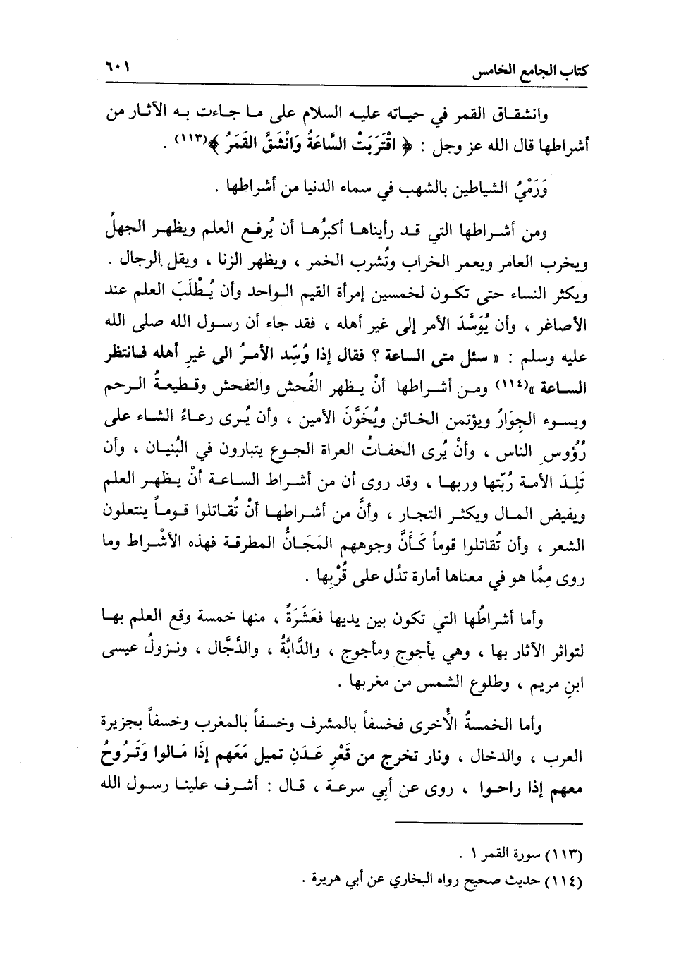 ومن أشراطها التي قد رأيناها أكبرها أن يرفع العلم ويظهر الجهل ويخرب العامر ويعمر الخراب وتشرب الخمر، ويظهر الزنا، ويقل الرجال. ويكثر النساء حتى تكون لخمسين امرأة القيم الواحد، وأن يطلب العلم عند الأصاغر، وأن يوسد الأمر إلى غير أهله، فقد جاء أن رسول الله - صَلَّى اللَّهُ عَلَيْهِ وَسَلَّمَ -: «سئل متى الساعة؟ فقال: إذا وسد الأمر إلى غير أهله فانتظر الساعة» ومن أشراطها: أن يظهر الفحش والتفحش وقطيعة الرحم، ويسوء الجوار ويؤتمن الخائن ويخون الأمين، وأن يرى رعاء الشاء على رؤوس الناس، وأن يرى الحفاة العراة الجوع يتبارون في البنيان، وأن تلد الأمة ربتها وربها، وقد روي أن من أشراط الساعة أن يظهر العلم ويفيض المال، ويكثر التجار، وأن من أشراطها أن تقاتلوا قوما ينتعلون الشعر، وأن تقاتلوا قوما كأن وجوههم المجان المطرقة فهذه الأشراط، وما روي مما هو في معناها أمارة تدل على قربها.