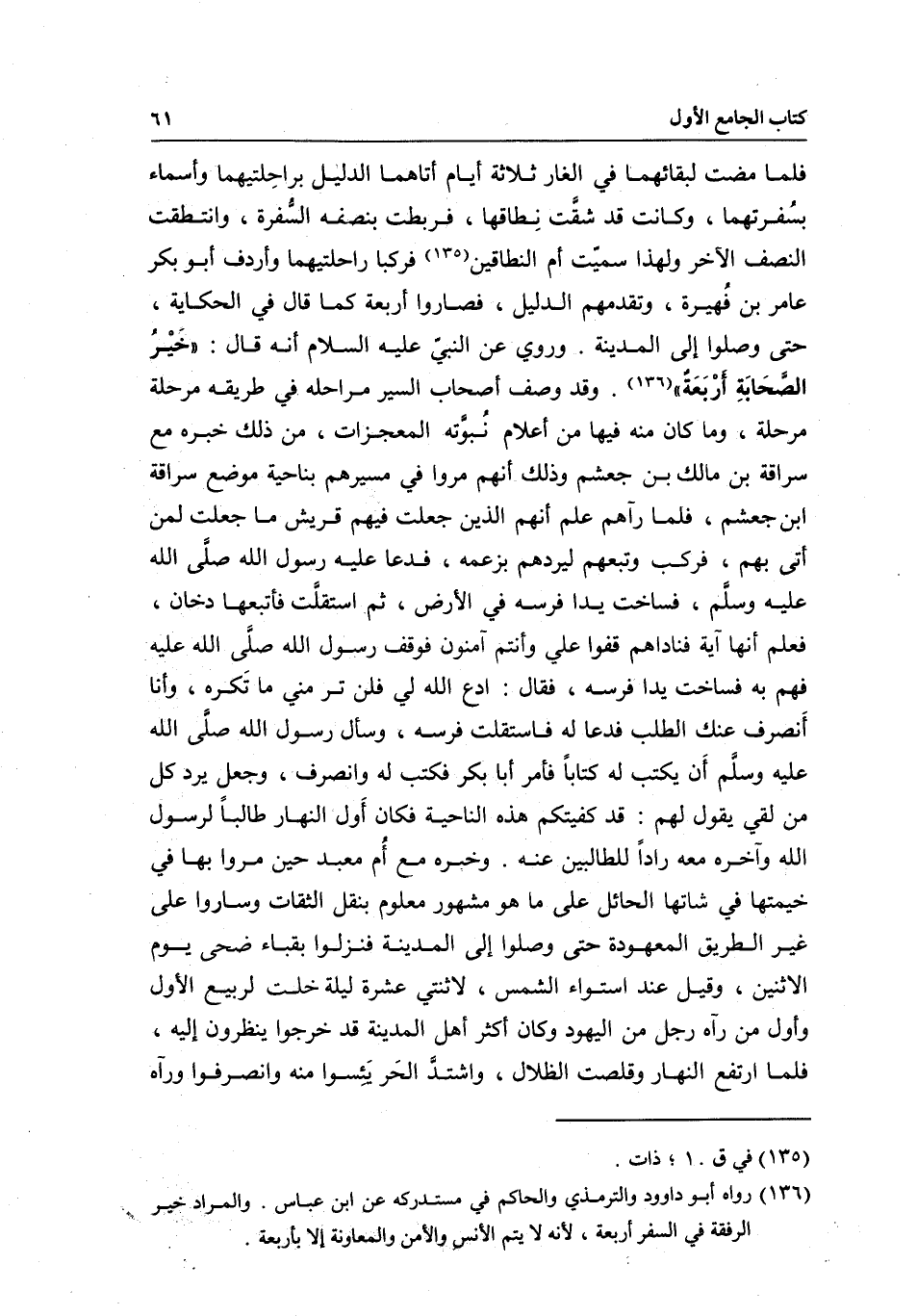فلما مضت لبقائهما في الغار ثلاثة أيام أتاهما الدليل براحِلتيهما وأسماء بسُفرتهما، وكانت قد شقًت نِطاقها، فربطتَ بنصفه السُفرة، وانتطقت النصف الآخر ولهذا سميّت أم النطاقين فركبا راحلتيهما وأردف أبو بكر عامر بن فُهيرة، وتقدمهم الدليل، فصاروا أربعة كما قال في الحكاية، حتى وصلوا إلى المدينة. وروي عن النبيّ - عَلَيْهِ السَّلَامُ - أنه قال: «خَيْرُ الصَّحَابَةِ أَرْبَعَةٌ» . وقد وصف أصحاب السير مراحله في طريقه مرحلة مرحلة، وما كان منه فيها من أعلام نبوَته المعجزات، من ذلك خبره مع سراقة بن مالك بن جعشم وذلك أنهم مروا في مسيرهم بناحية موضع سراقة بن جعشم، فلما رآهم علم أنهم الذين جعلت فيهم قريش ما جعلت لمن أتى بهم، فركب وتبعهم ليردهم بزعمه، فدعا عليه رسول الله - صَلَّى اللَّهُ عَلَيْهِ وَسَلَّمَ -، فساخت يدا فرسه في الأرض، ثم استقلَّت فأتبعها دخان، فعلما أنها آية فناداهم قفوِا علي وأنتم آمنون فوقف رسول الله صَلَّى اللَّهُ عَلَيْهِ فهم به فساخت يدا فرسه، فقال: ادع الله لي فلن تر مني ما تَكره، وأنا أَنصرف عنك الطلب فدعا له فاستقلت فرسه، وسأل رسول الله - صَلَّى اللَّهُ عَلَيْهِ وَسَلَّمَ - أَن يكتب له كتاباً فأمر أبا بكر فكتب له وانصرف، وجعل يرد كل من لقي يقول لهم: قد كفيتكم هذه الناحية فكان أَول النهار طالباً لرسول الله وآخره معه راداً للطالبين عنه. وخبره مع أُم معبد حين مروا بها في خيمتها في شاتها الحائل على ما هو مشهور معلوم بنقل الثقات وساروا على غير الطريق المعهودة حتى وصلوا إلى المدينة فنزلوا بقباء ضحى يوم الاثنين، وقيل: عند استواء الشمس، لاثنتي عشرة ليلة خلت لربيع الأول، وأول من رآه رجل من اليهود وكان أكثر أهل المدينة قد خرجوا ينظرون إليه، فلما ارتفع النهار وقلصت الظلال، واشتدَّ الحَر يَئِسوا منه وانصرفوا ورآه