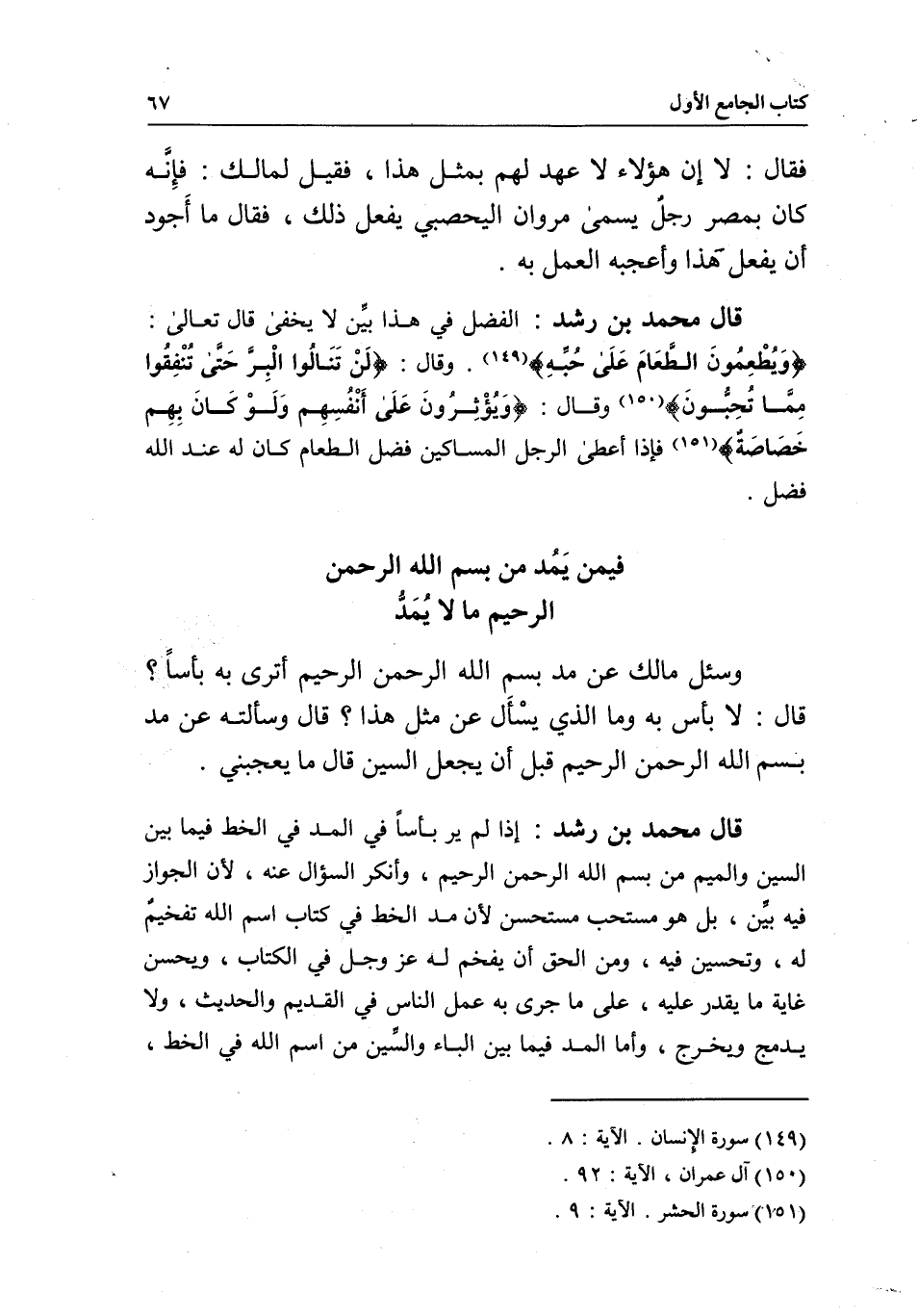 فيمن يَمُد من بِسْمِ اللَّهِ الرَّحْمَنِ الرَّحِيمِ " ما لا يُمَدُّ وسئل مالك: عن مد " بِسْمِ اللَّهِ الرَّحْمَنِ الرَّحِيمِ "، أترى به بأساً؟ قال: لا بأس به، وما الذي يسْأَل عن مثل هذا؟ قال: وسألته عن مد " بِسْمِ اللَّهِ الرَّحْمَنِ الرَّحِيمِ " قبل أن يجعل السين، قال: ما يعجبني.