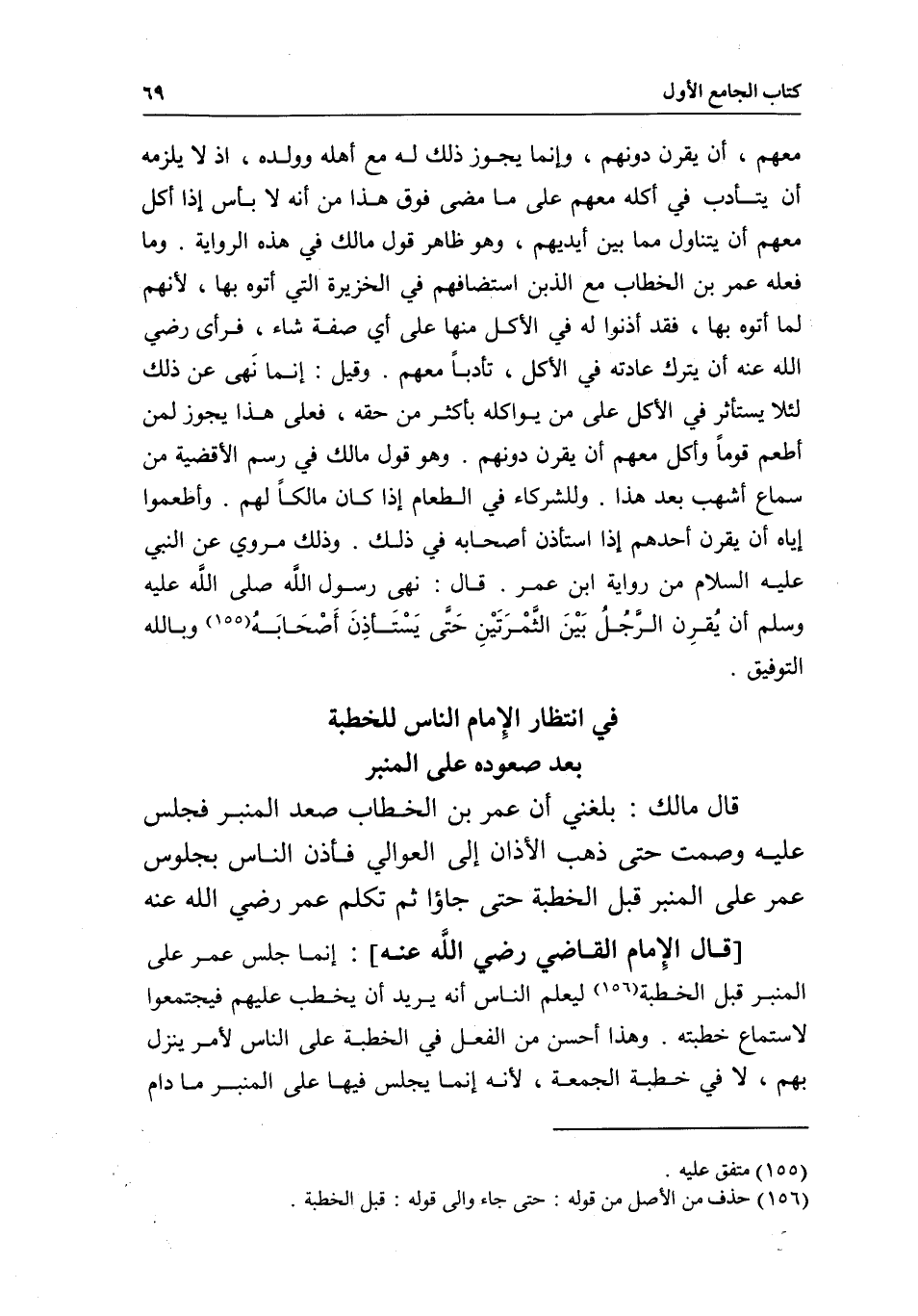 [قال الِإمام القاضي - رَضِيَ اللَّهُ عَنْهُ -] : إنما جلس عمر على المنبر قبل الخطبة ليعلم الناس أنه يريد أن يخطب عليهم فيجتمعوا لاستماع خطبته. وهذا أحسن من الفعل في الخطبة على الناس لأمر ينزل بهم، لا في خطبة الجمعة؛ لأنه إنما يجلس فيها على المنبر ما دام