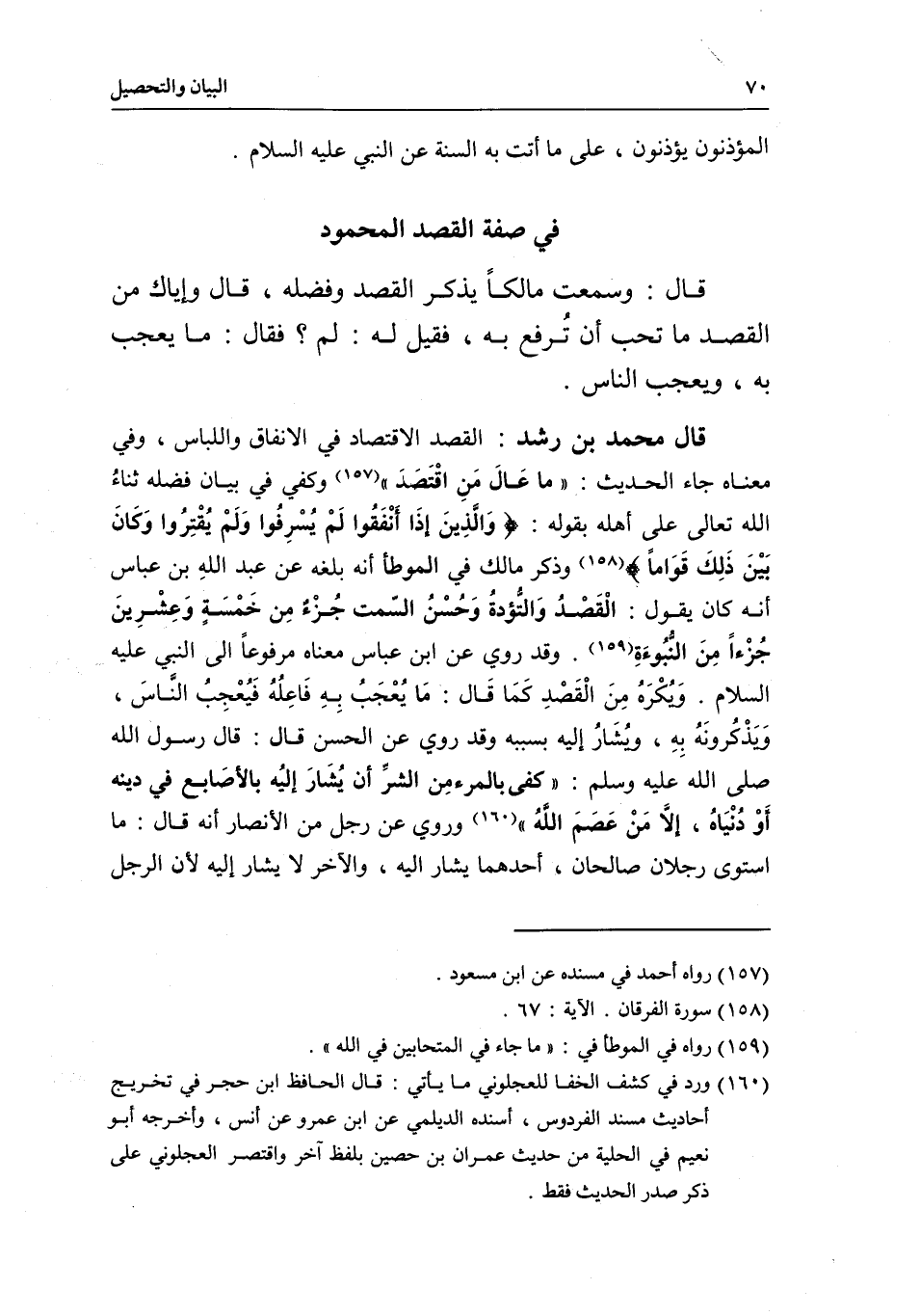 قال محمد بن رشد: القصد الاقتصاد في الإنفاق واللباس، وفي معناه جاء الحديث: «ما عَالَ مَنِ اقْتَصَدَ» ، وكفى في بيان فضله ثناءُ الله تعالى على أهله بقوله: {وَالَّذِينَ إِذَا أَنْفَقُوا لَمْ يُسْرِفُوا وَلَمْ يَقْتُرُوا وَكَانَ بَيْنَ ذَلِكَ قَوَامًا} [الفرقان: 67] ، وذكر مالك في الموطأ أنه بلغه عن عبد اللهِ بن عباس أنه كان يقول: الْقَصْدُ وَالتُّؤدة وَحُسْنُ السّمت جُزْءٌ مِن خَمْسِةِ وَعِشْرِينَ جُزْءاً مِنَ النُّبُوءَةِ. وقد روي عن ابن عباس معناه مرفوعاً إلى النبي - عَلَيْهِ السَّلَامُ -. وَيُكْرَهُ مِنَ الْقَصْدِ كَمَا قَال: مَا يُعْجَبُ بِهِ فَاعِلُه فَيُعْجِبُ النَاسَ، وَيَذْكُرونَهُ بِهِ، ويُشَارُ إليه بسببه.