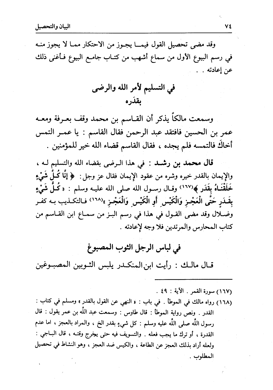 قال محمد بن رشد: في هذا الرضا بقضاء الله والتسليم له، والِإيمان بالقدر خيره وشره من عقود الِإيمان، فقال عز وجل: {إِنَّا كُلَّ شَيْءٍ خَلَقْنَاهُ بِقَدَرٍ} [القمر: 49] ، وقال رسول الله - صَلَّى اللَّهُ عَلَيْهِ وَسَلَّمَ -: «كُلُّ شَيْءٍ بِقَدَرٍ حَتًّى الْعَجْزِ وَالْكَيْس، أَوِ الْكَيْس وَالْعَجْزِ» ، فالتكذيب به كفر وضلال، وقد مضى القول في هذا في رسم البز من سماع ابن القاسم من كتاب المحاربين والمرتدين، فلا وجه لِإعادته.