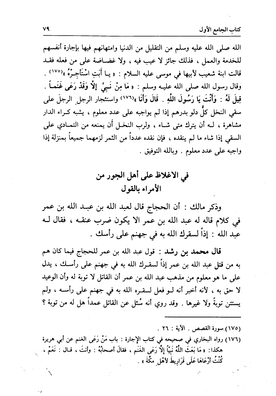 قال محمد بن رشد: قول عبد الله بن عمر للحجاج فيما كان هم به من قتل عبد الله بن عمر: إذن لسقرك الله به في جهنم على رأسك - يدل على ما هو معلوم من مذهب عبد الله بن عمر أن القاتل لا توبة له وأن الوعيد لاحق به؛ لأنه أخبر أنه لو فعل لسقره الله به في جهنم على رأسه، ولم يستثن توبةً ولا غيرها. وقد روي أنه سُئل عن القاتل عمداً هل له من توبة؟