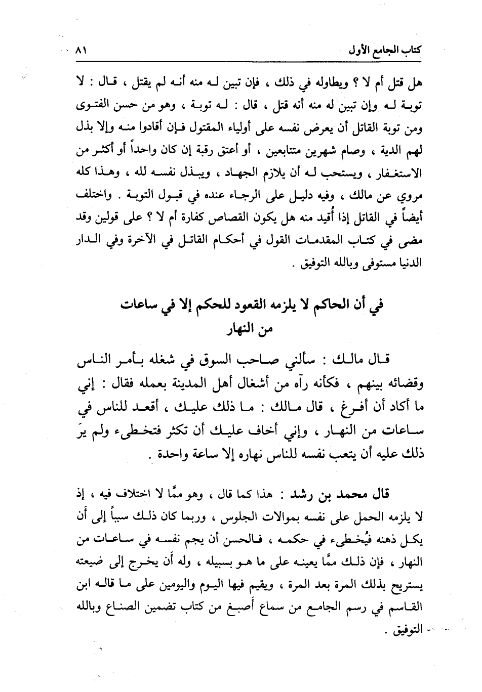 في أن الحاكم لا يلزمه القعود للحكم إلا في ساعات من النهار قال مالك: سألني صاحب السوق في شغله بأمر الناس وقضائه بينهم، فكأنه رآه من أشغال أهل المدينة بعمله، فقال: إني ما أكاد أن أفرغ، قال مالك: ما ذلك عليك، اقعد للناس في ساعات من النهار، وإني أخاف عليك أن تكثر فتخطئ، ولم يرَ ذلك عليه، أن يتعب نفسه للناس نهاره إلا ساعة واحدة.