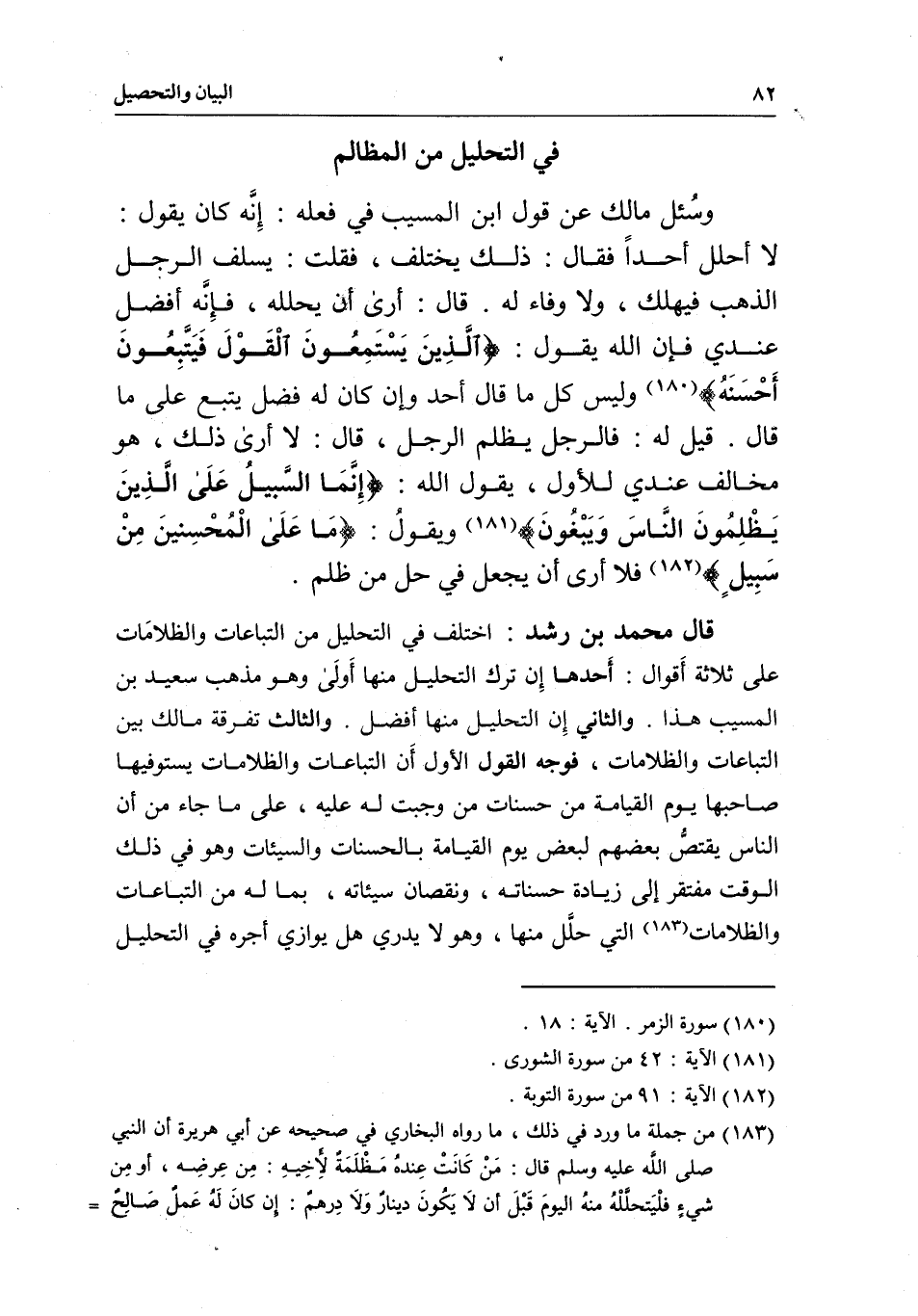 في التحليل من المظالم وسُئل مالك: عن قول ابن المسيب في فعله: إِنَّه كان يقول: لا أحلل أحداً، فقال: ذلك يختلف، فقلت: يسلف الرجل الذهب فيهلك، ولا وفاء له. قال: أرى أن يحلله، فإِنَّه أفضلِ عندي فإن الله يقول: {الَّذِينَ يَسْتَمِعُونَ الْقَوْلَ فَيَتَّبِعُونَ أَحْسَنَهُ} [الزمر: 18] وليس كل ما قال أحد وإن كان له فضل يتبع على ما قال. قيل له: فالرجل يظلم الرجل، قال: لا أرى ذلك، هو مخالف عندي للأول، يقول الله: {إِنَّمَا السَّبِيلُ عَلَى الَّذِينَ يَظْلِمُونَ النَّاسَ وَيَبْغُونَ} [الشورى: 42] ويقولُ: {مَا عَلَى الْمُحْسِنِينَ مِنْ سَبِيلٍ} [التوبة: 91] فلا أرى أن يجعل في حل من ظلم.